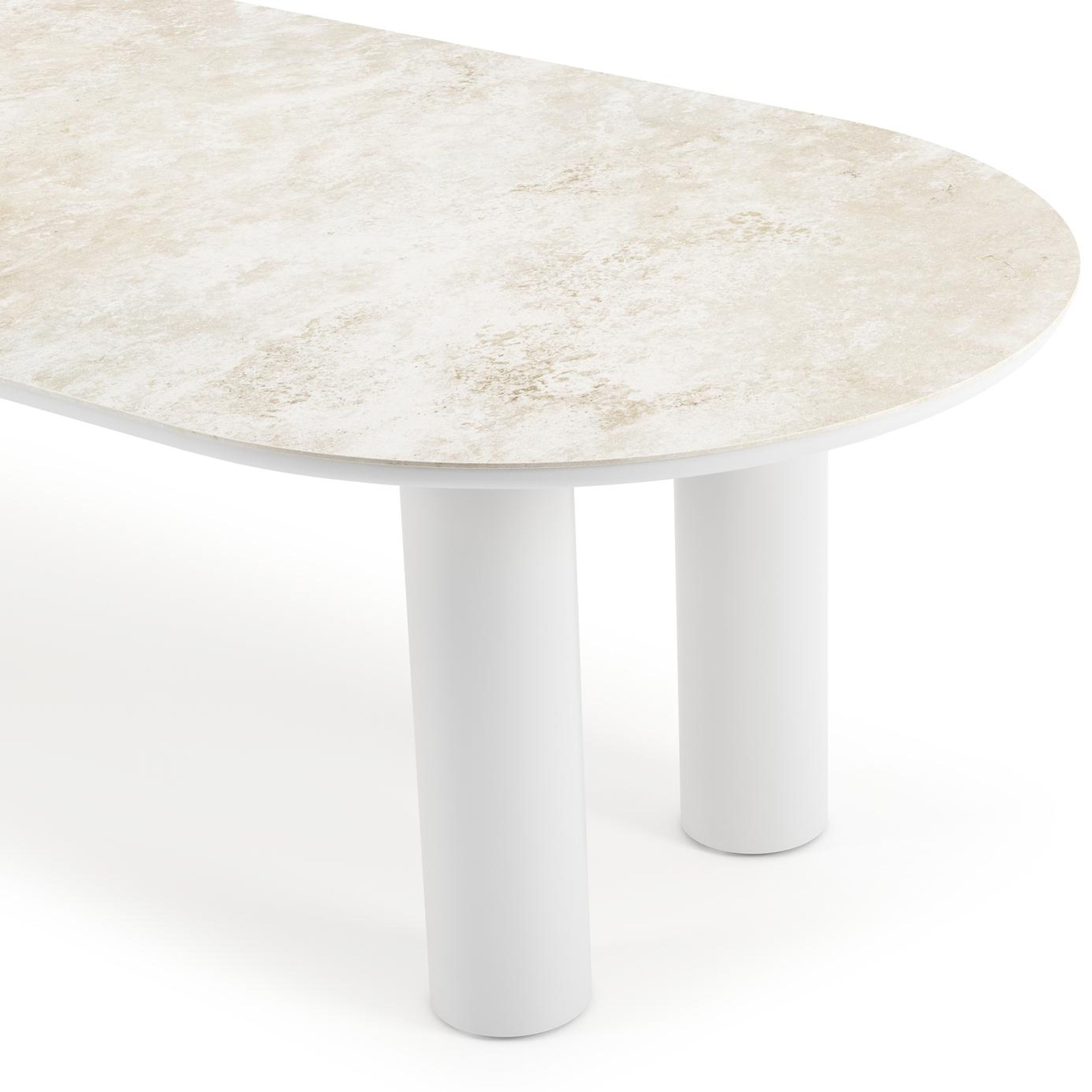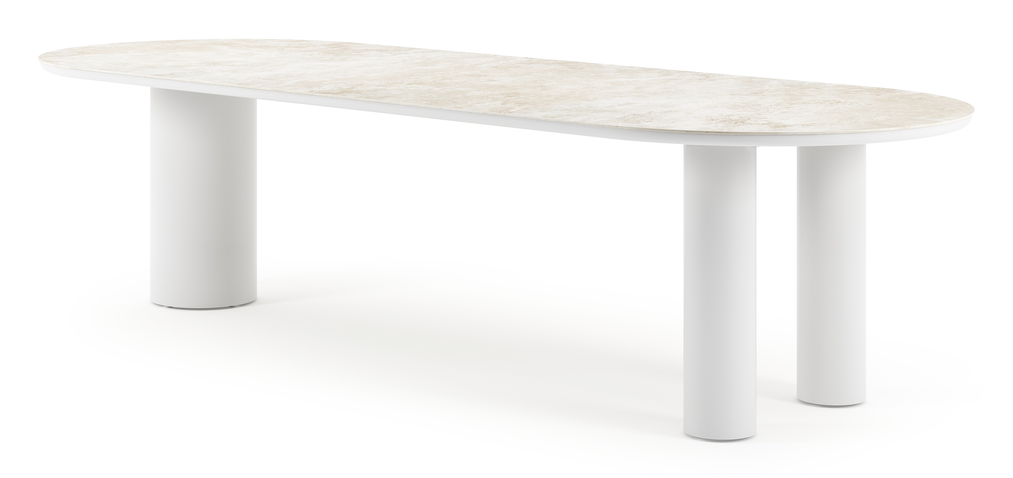 La table de jardin Organo se distingue par son design unique, avec un plateau de table de forme ovale qui lui confère une allure contemporaine. La table repose sur un pied rond robuste et épais, et sur deux pieds ronds plus fins. Ensemble, ils créent un équilibre magistral entre le luxe et la modernité, faisant de cette table la pièce maîtresse de votre espace extérieur.