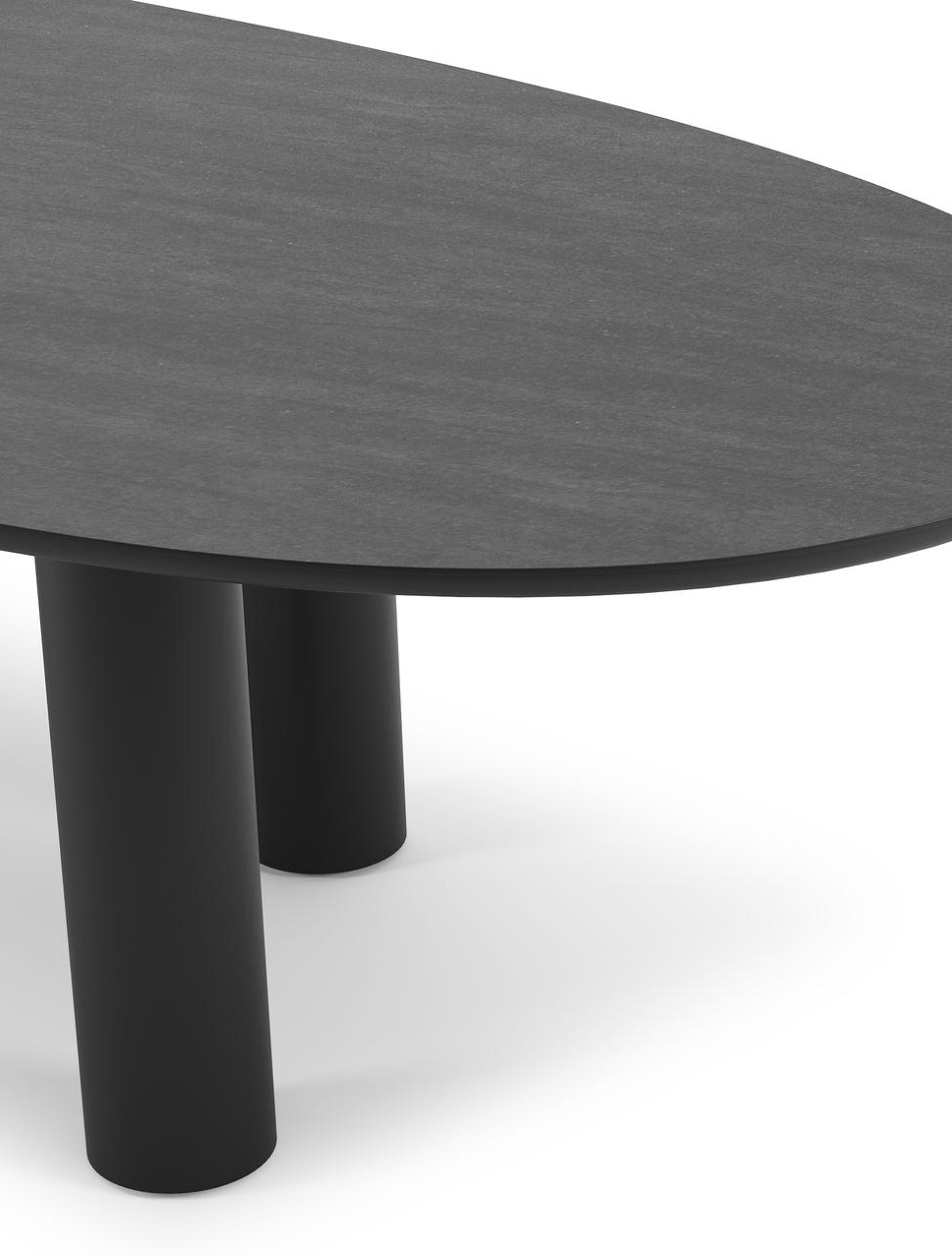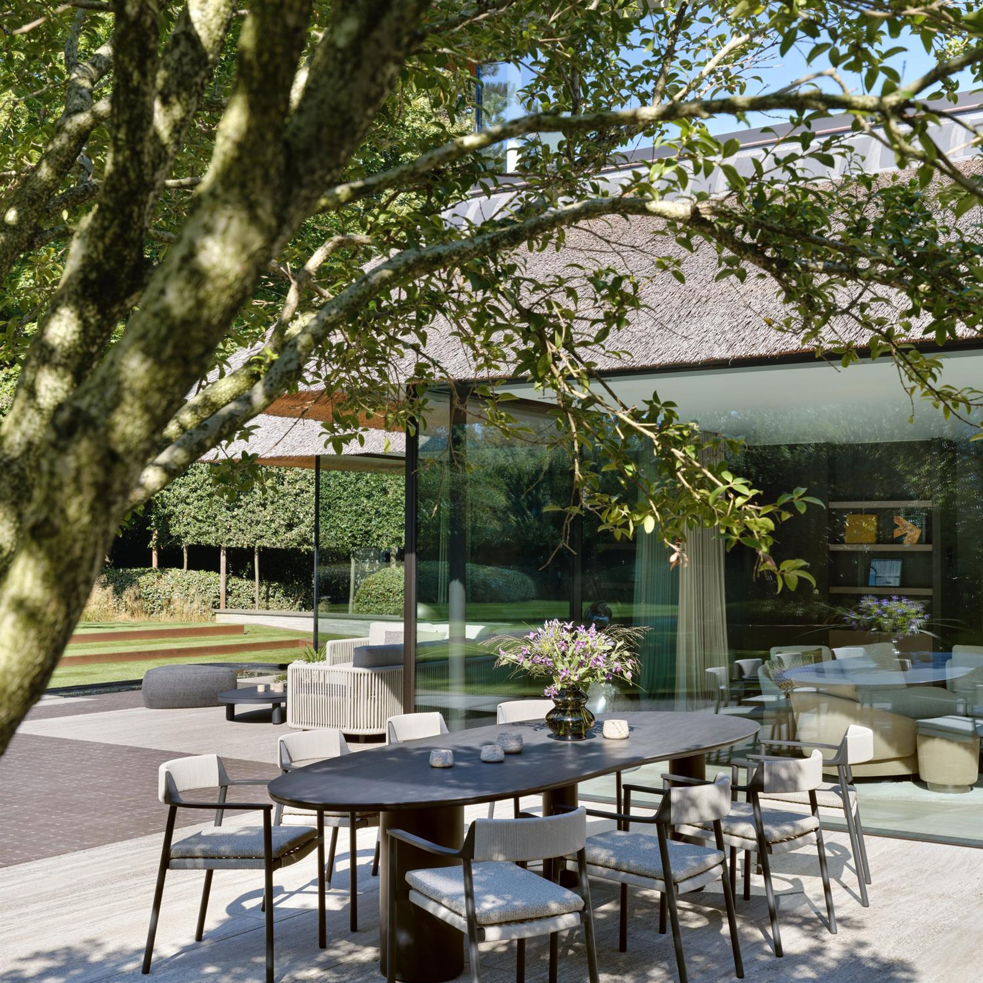 La table de jardin Organo se distingue par son design unique, avec un plateau de table de forme organique qui lui confère une allure contemporaine. La table repose sur un pied rond robuste et épais, et sur deux pieds ronds plus fins. Ensemble, ils créent un équilibre magistral entre le luxe et la modernité, faisant de cette table la pièce maîtresse de votre espace extérieur.