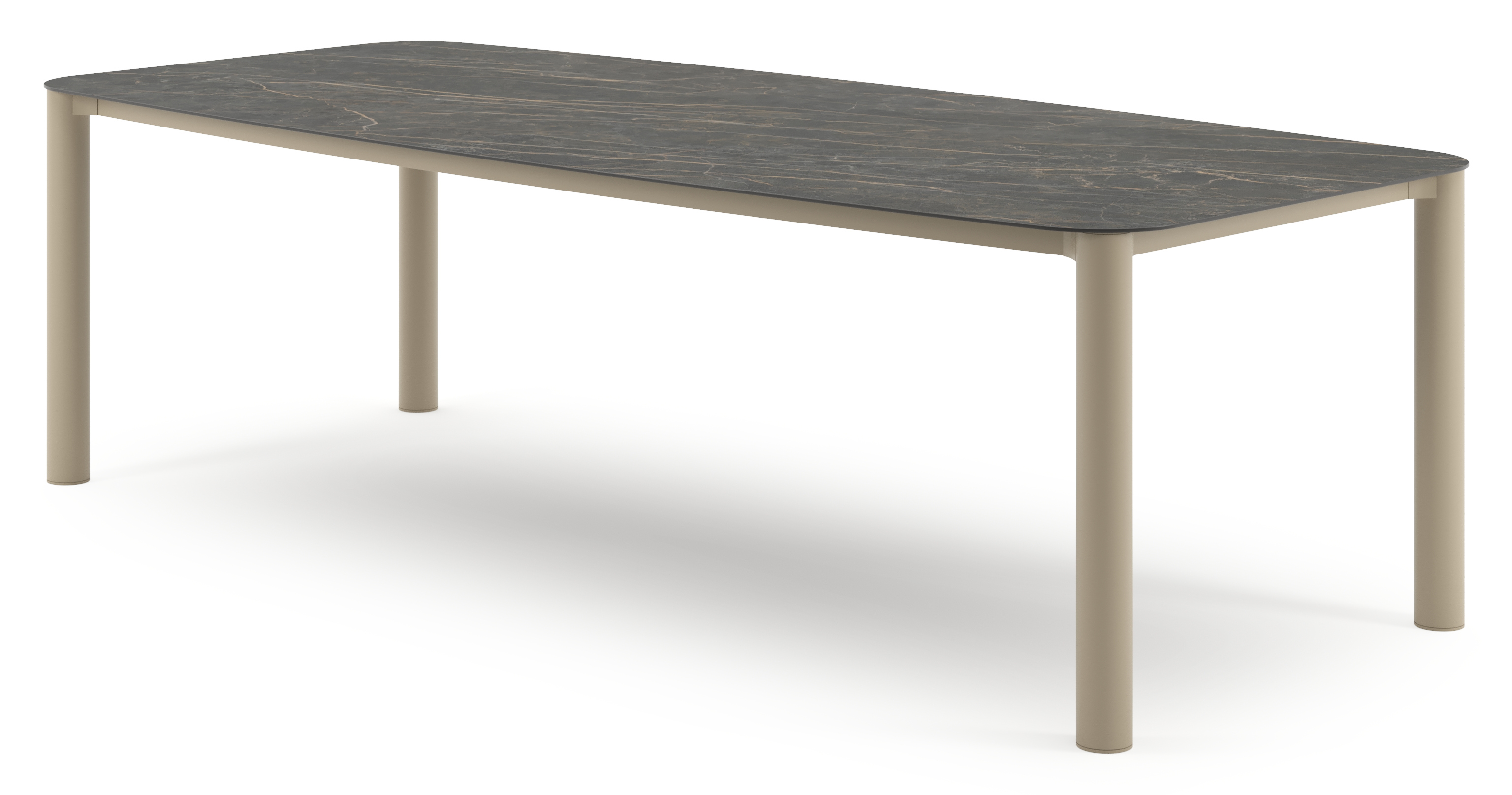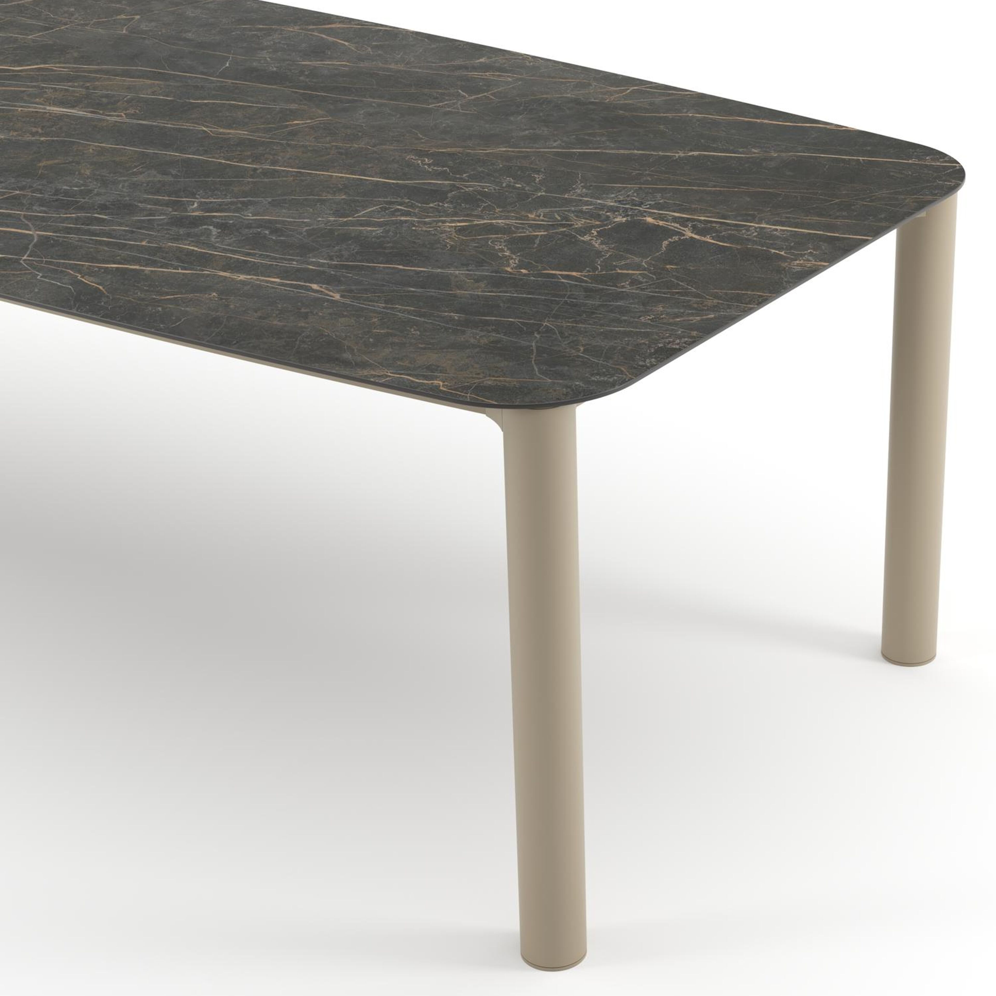 Table de jardin Orso forme de bateau en aluminium beige et céramique pleine Black Obsession - Lg. 255 x Lrg. 115 x Haut. 74.5 cm | Exterioo mobilier de jardin