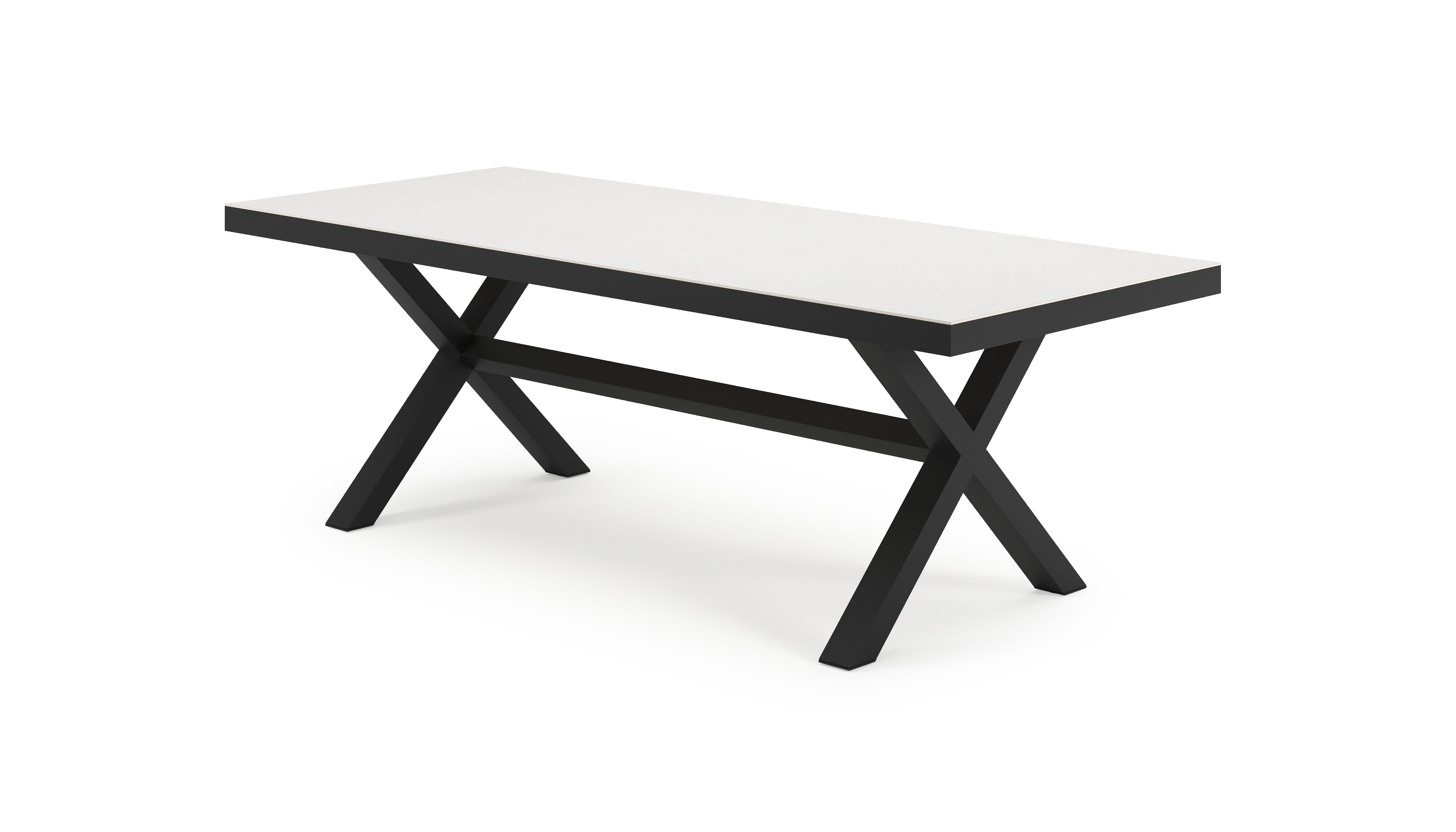 La table de jardin Reza se distingue par son piètement croisé unique et son cadre épais et robuste dans lequel le plateau est intégré. Une poutre centrale traverse la table pour offrir un soutien supplémentaire à la structure.