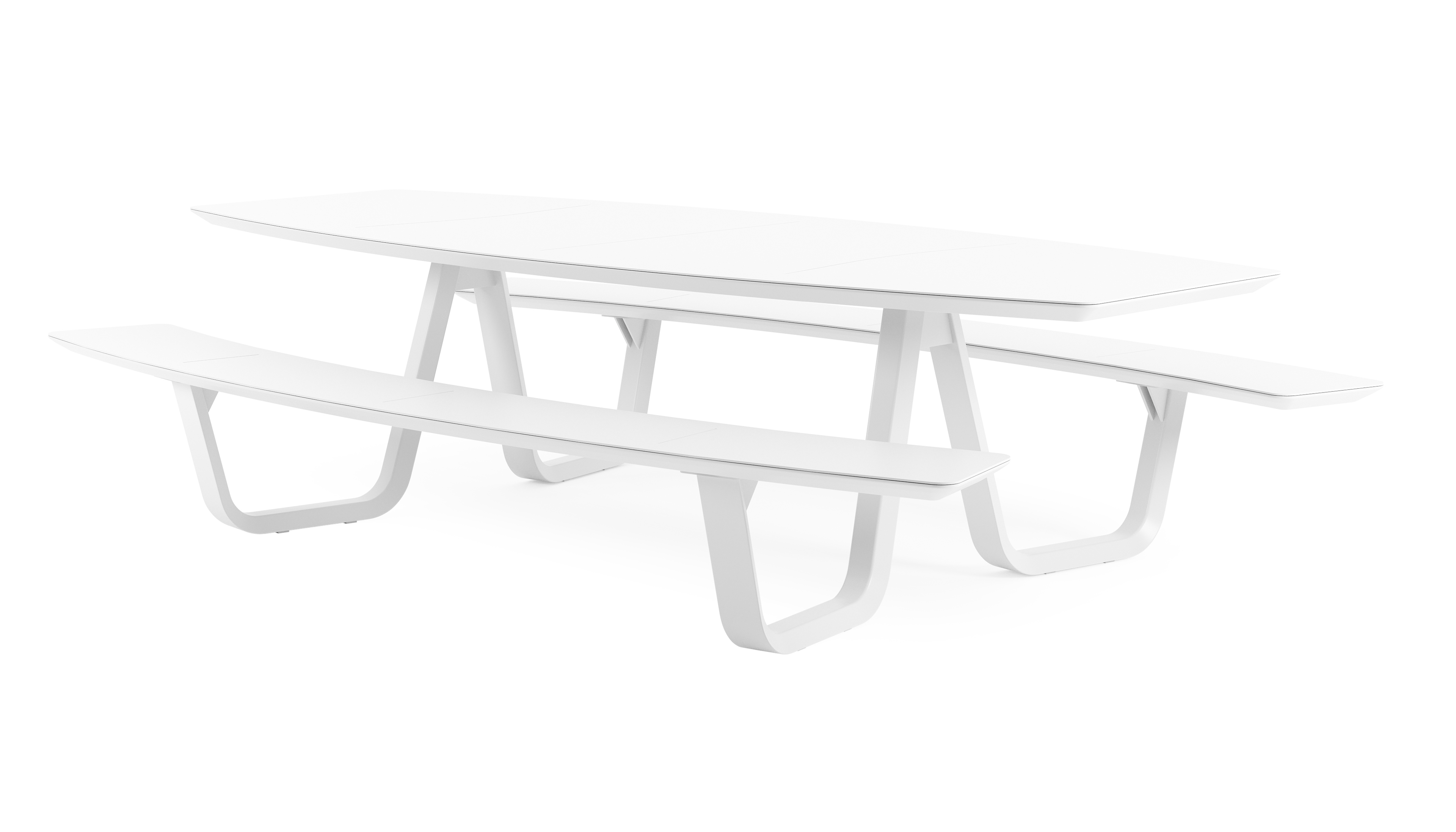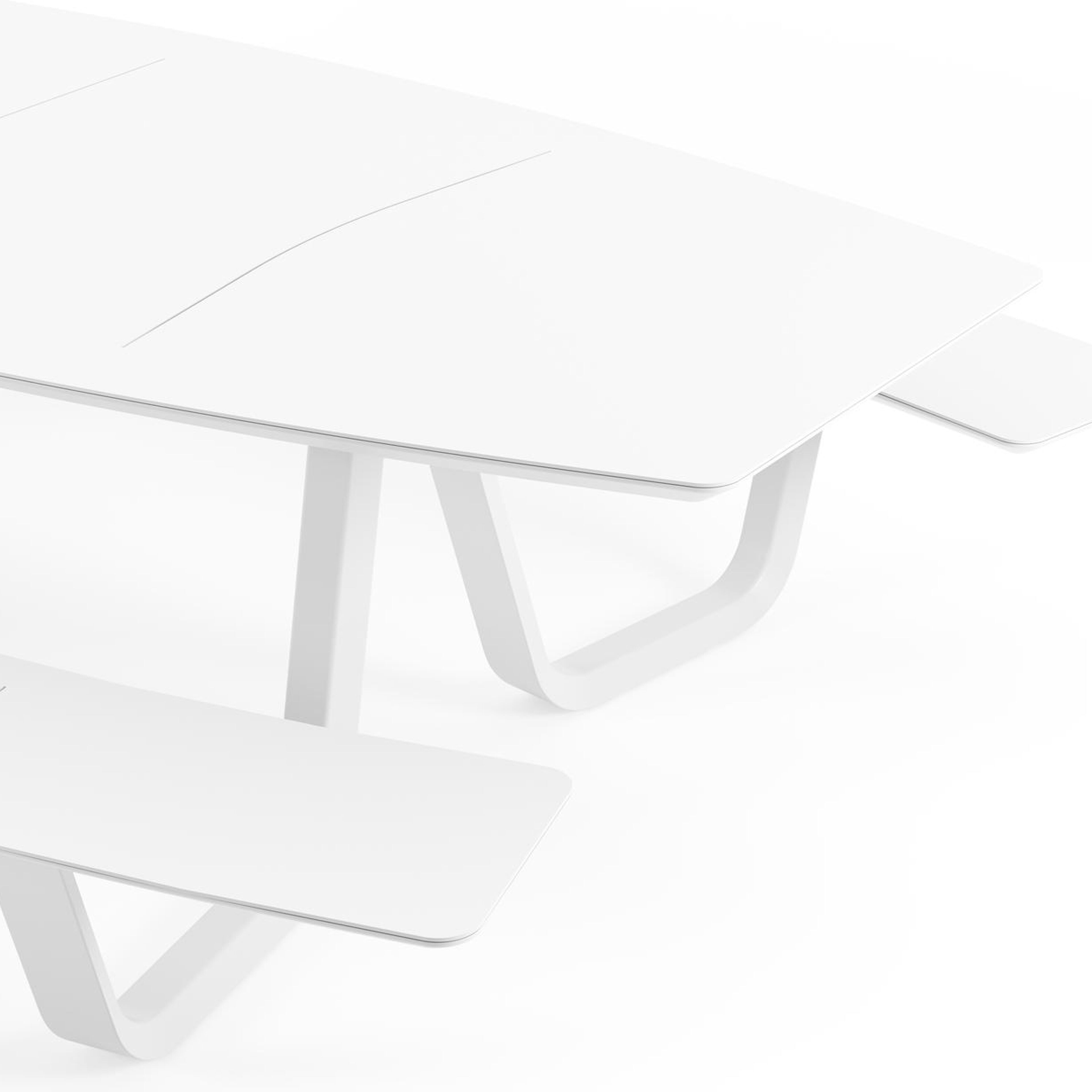 La table de pique-nique Forno se caractérise par ses formes arrondies. Tant le plateau de la table que les bancs ont une forme de bateau. Le banc incurvé est facilement accessible et offre de l'espace pour une grande réception.