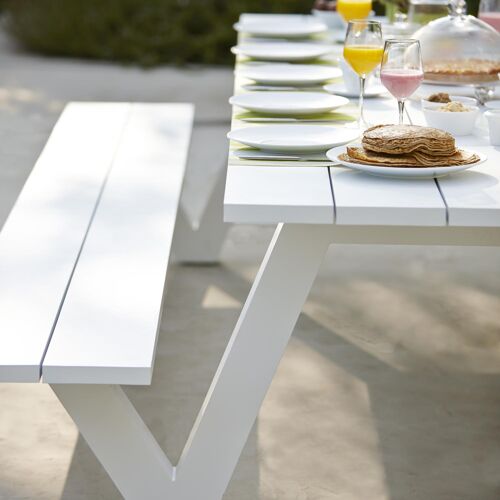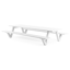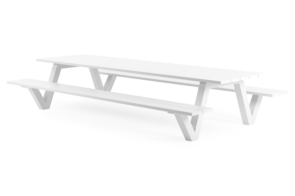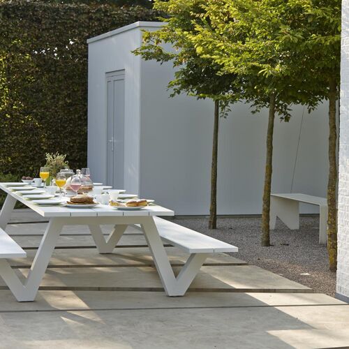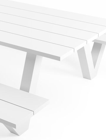 La table de pique-nique Norma présente un aspect contemporain et défini. La table est reconnaissable à son pied en forme V sous l'armature.