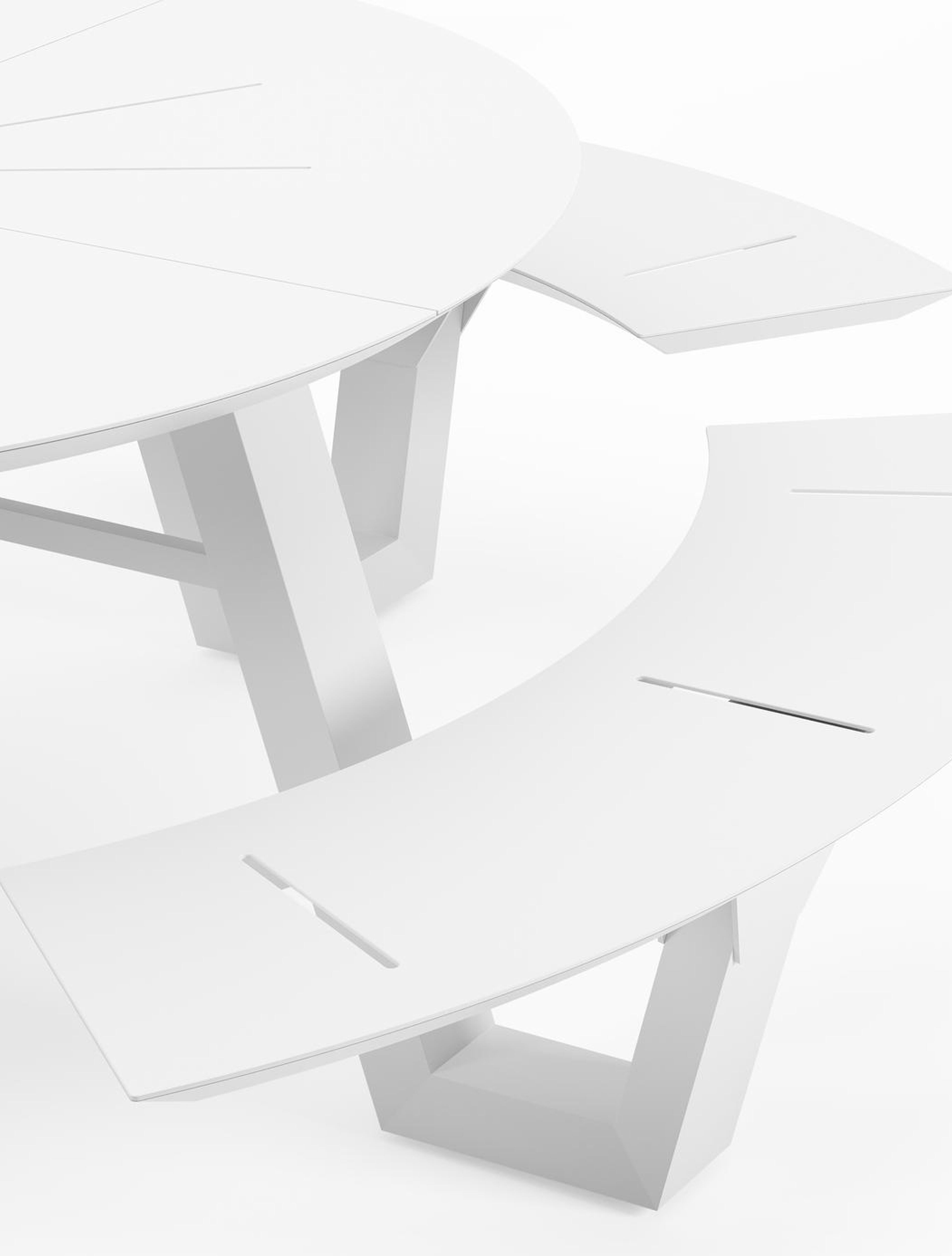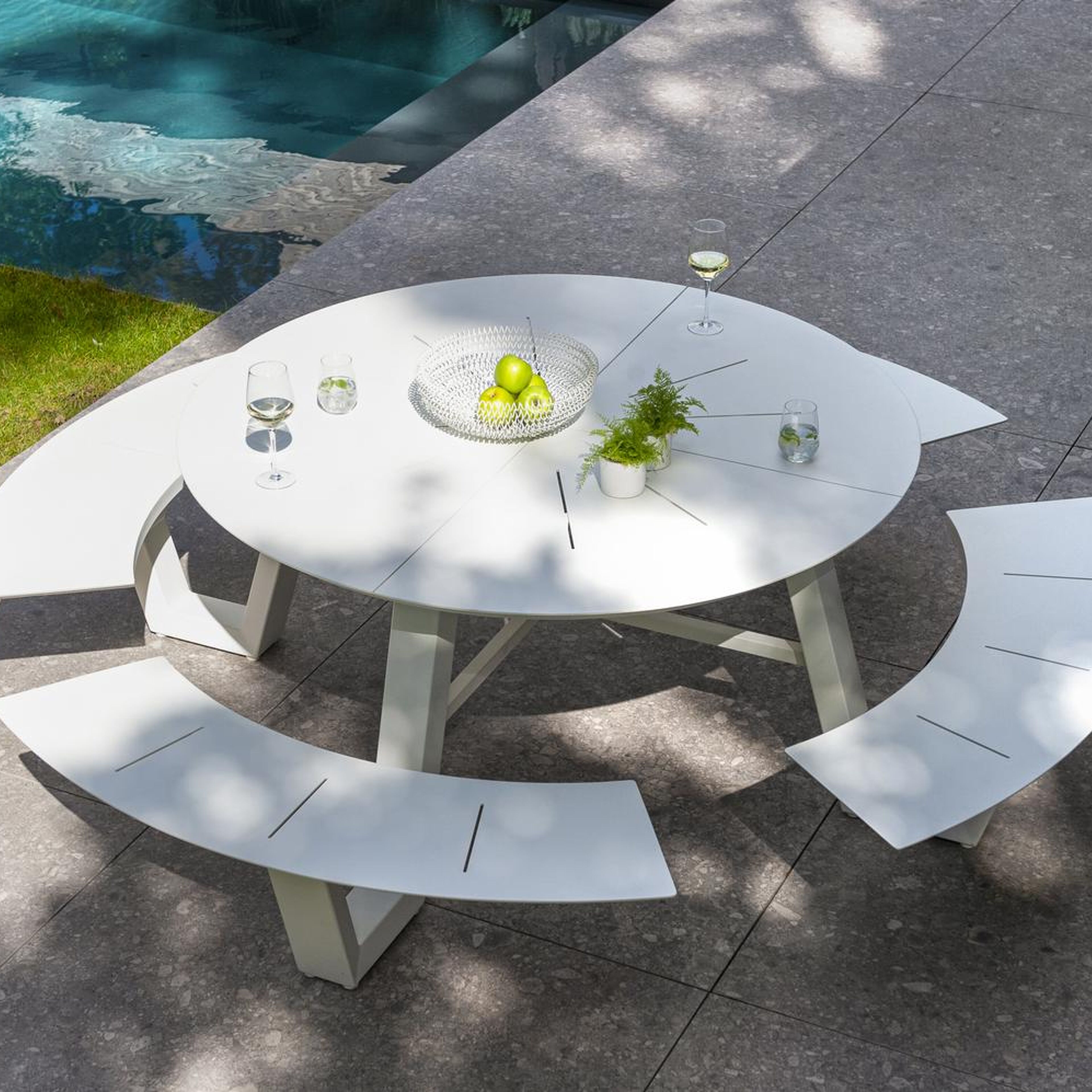 La table de pique-nique Rondino adopte un design minimaliste avec un aspect robuste. Les bancs allongés s'intègrent parfaitement à l'armature de la table, créant ainsi un look épuré et cohérent. La forme ronde permet de s'asseoir confortablement.