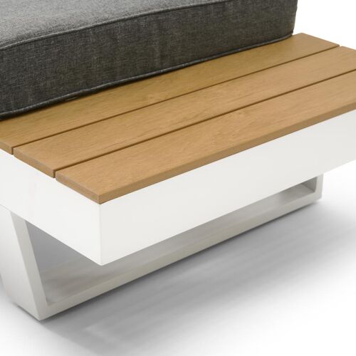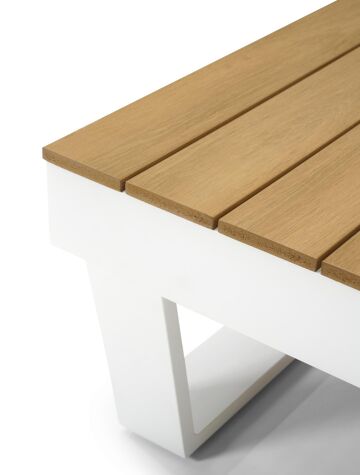 De loungetafel is inbegrepen in de loungeset en gemaakt uit een onderstel van roestvrij aluminium. De afwerking van het tafelblad bestaat uit polywood.