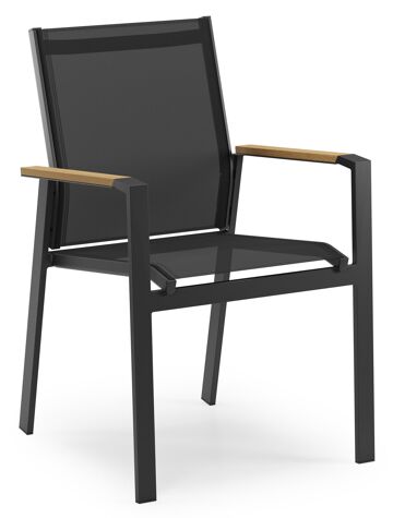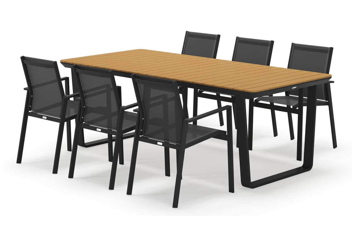 Alora tuinset in zwart aluminium en polywood tafelblad met 6 stapelbare Bahia tuinstoelen | Exterioo