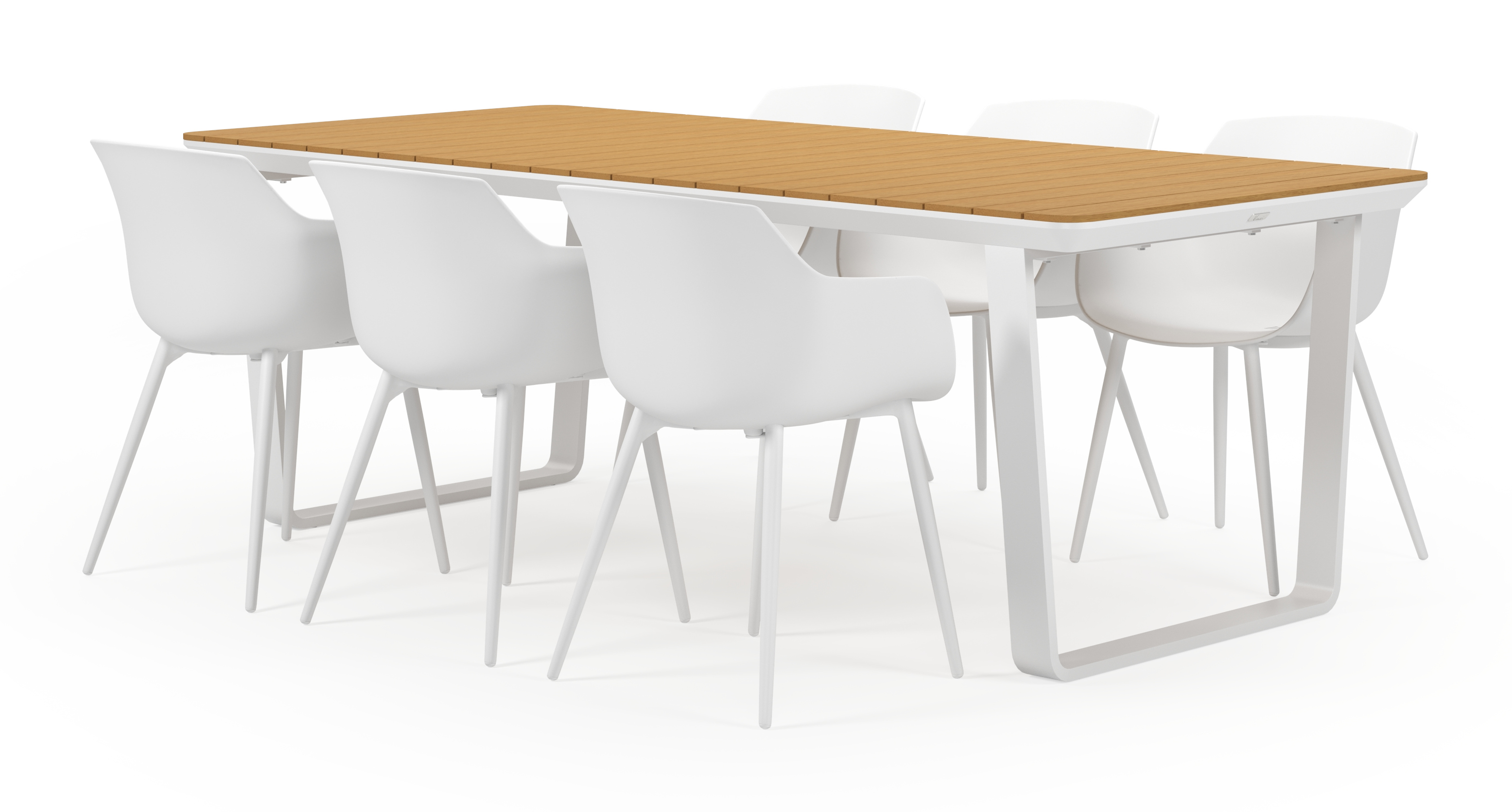 Alora tuinset heeft een eigen specifieke stijl met afgeronde lijnen. Het frame loopt schuin af en het tafelblad loopt de rand. De trapeziumvormige tafelpoten zijn geïntegreerd onder het frame en lopen volledig door.