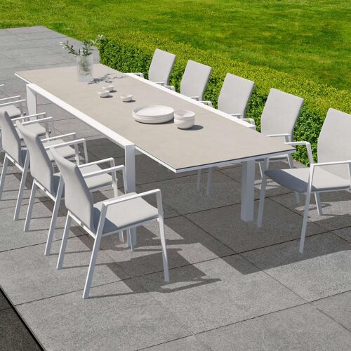Aspra tuinset met verlengbare tafel in wit aluminium en grijs volkeramiek op glas tafelblad met 10 stapelbare Madura tuinstoelen | Exterioo