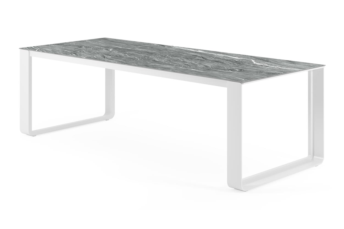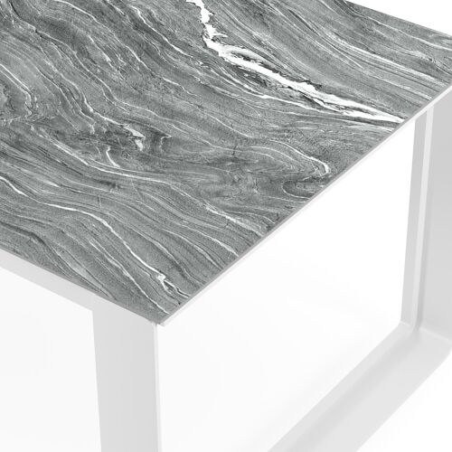 De Atessa tafel heeft een trendy design en is herkenbaar aan zijn vloeiend U-vormig onderstel. Deze tafel is afgewerkt met een Mar Del Plata tafelblad. Een uniek tafelblad waarin de golven van de zee weerspiegelen. In de tafel vind je glinsterende spikkels die zorgen voor een prachtig parelmoereffect. Het voordeel van volkeramische tafelbladen is dat ze krasbestendig zijn en bestand zijn tegen alle weersomstandigheden.