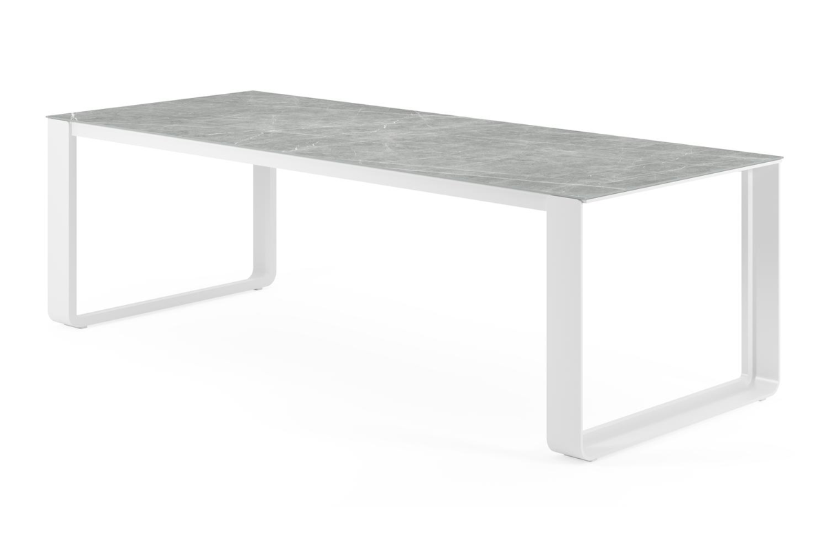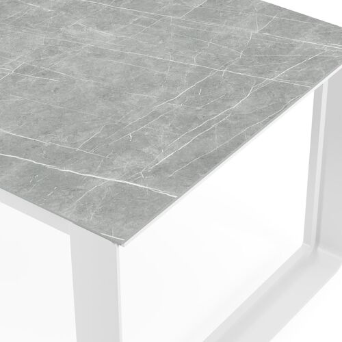 De Atessa tafel heeft een trendy design en is herkenbaar aan zijn vloeiend U-vormig onderstel. Deze tafel is afgewerkt met een Zaha Stone tafelblad. Een tafelblad met een industrieelgrijze kleurschakeringen en afgewerkt met door elkaar lopende krijtlijnen. Het voordeel van volkeramische tafelbladen is dat ze krasbestendig zijn en bestand zijn tegen alle weersomstandigheden.