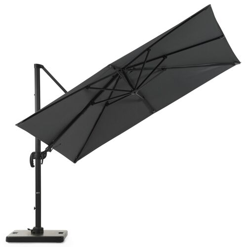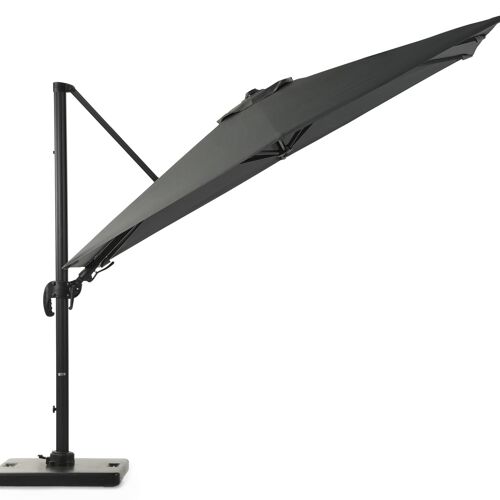 Avola zweefparasol met tiltfunctie in zwart aluminium met grijs all weather sunbrella® premium parasoldoek - L1: 300 x L2: 300 cm (met voet) | Exterioo