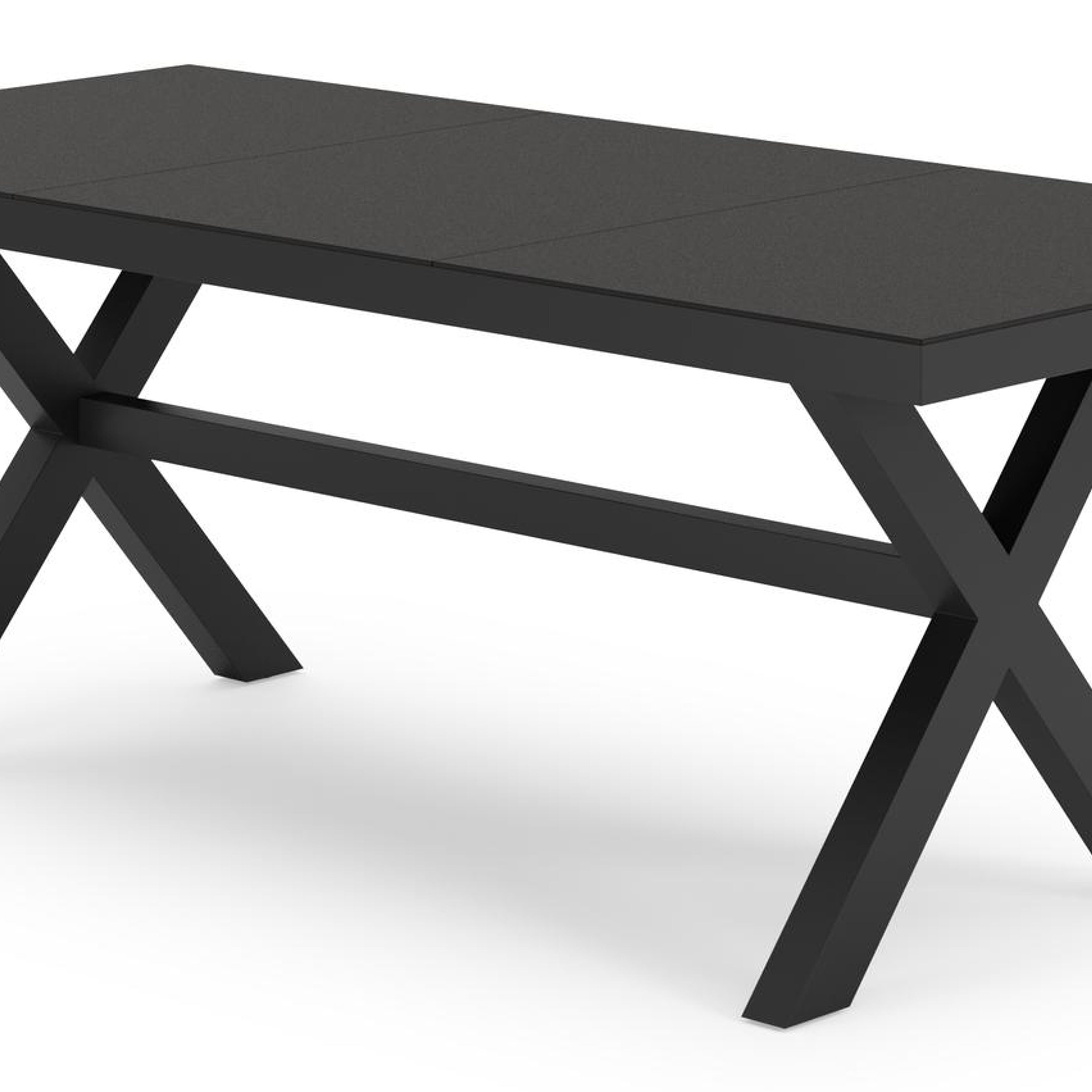De Bahia tuintafel herken je aan de stevige look en kruispoot. Het frame waarop het tafelblad ligt, is robuust. In het midden van de tafel loopt een balk als extra ondersteuning van het frame.