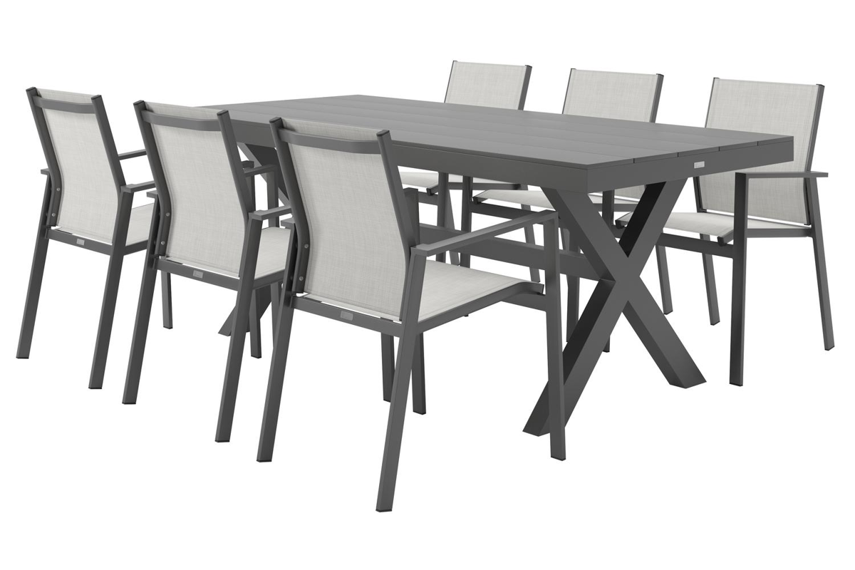 Bahia tuinset herken je aan de stevige look en kruispoot. Het frame waarop het tafelblad ligt, is robuust. In het midden van de tafel loopt een balk als extra ondersteuning van het frame.