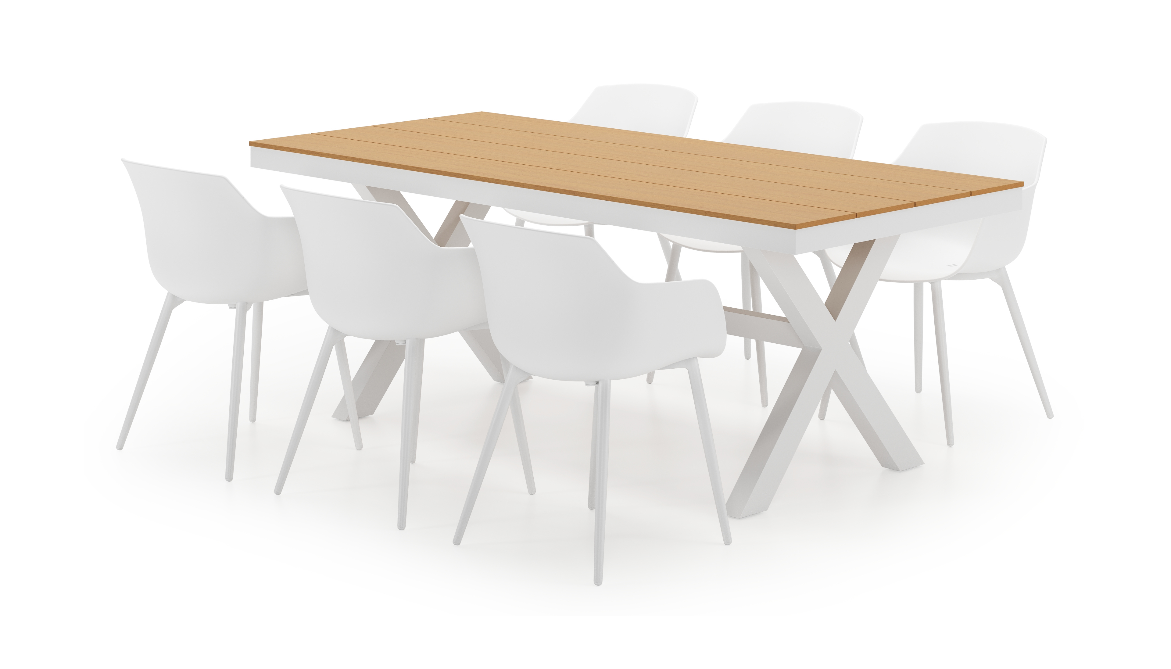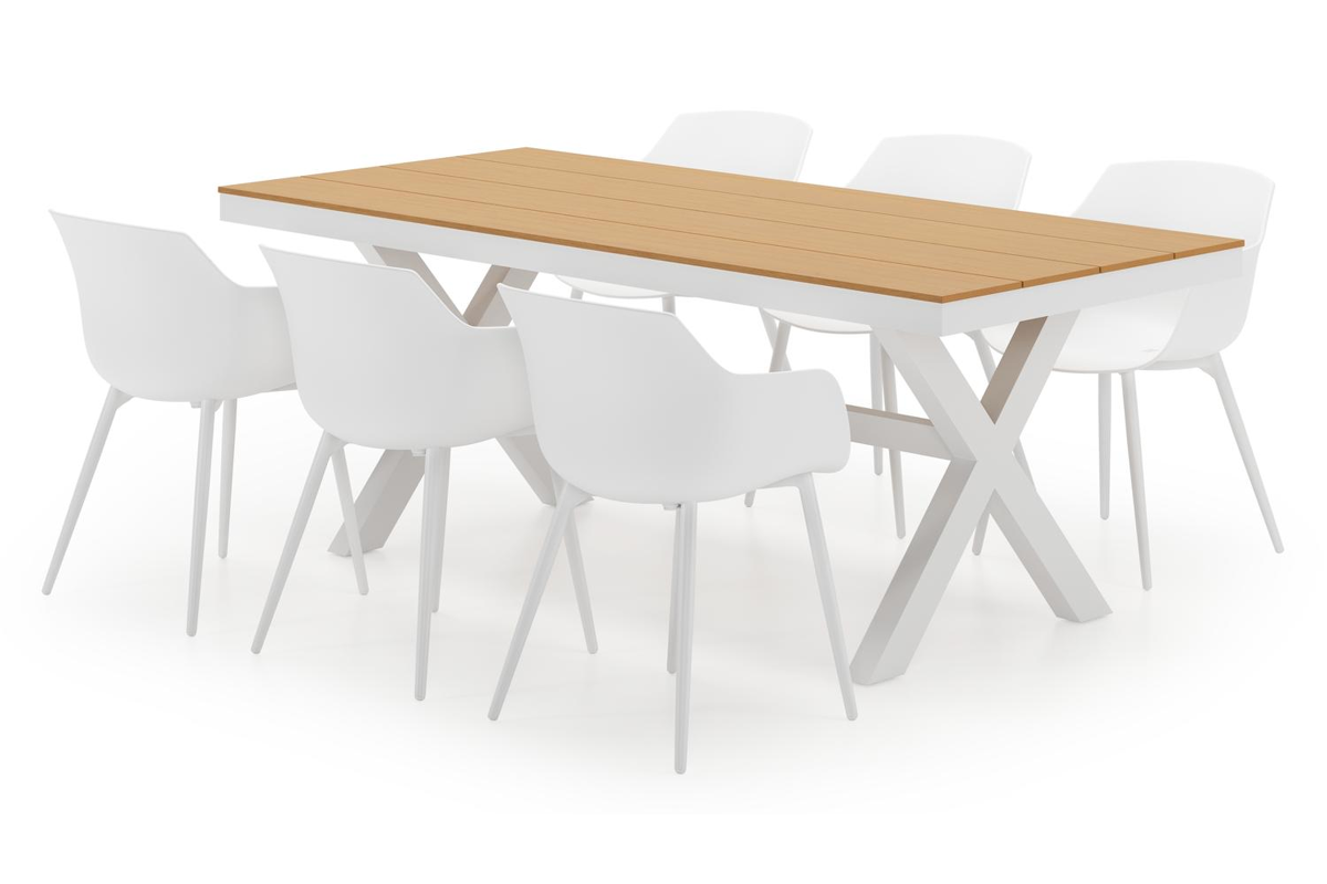 Bahia tuinset herken je aan de stevige look en kruispoot. Het frame waarop het tafelblad ligt, is robuust. In het midden van de tafel loopt een balk als extra ondersteuning van het frame.