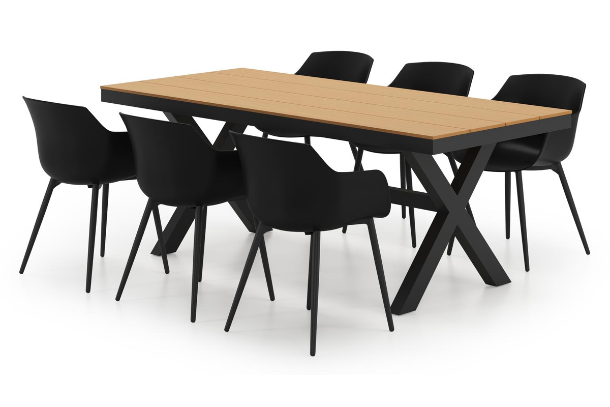 Bahia tuinset herken je aan de stevige look en kruispoot. Het frame waarop het tafelblad ligt, is robuust. In het midden van de tafel loopt een balk als extra ondersteuning van het frame.