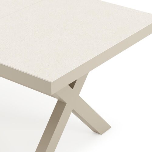 De Bahia tuintafel herken je aan de stevige look en kruispoot. Het frame waarop het tafelblad ligt, is robuust. In het midden van de tafel loopt een balk als extra ondersteuning van het frame.