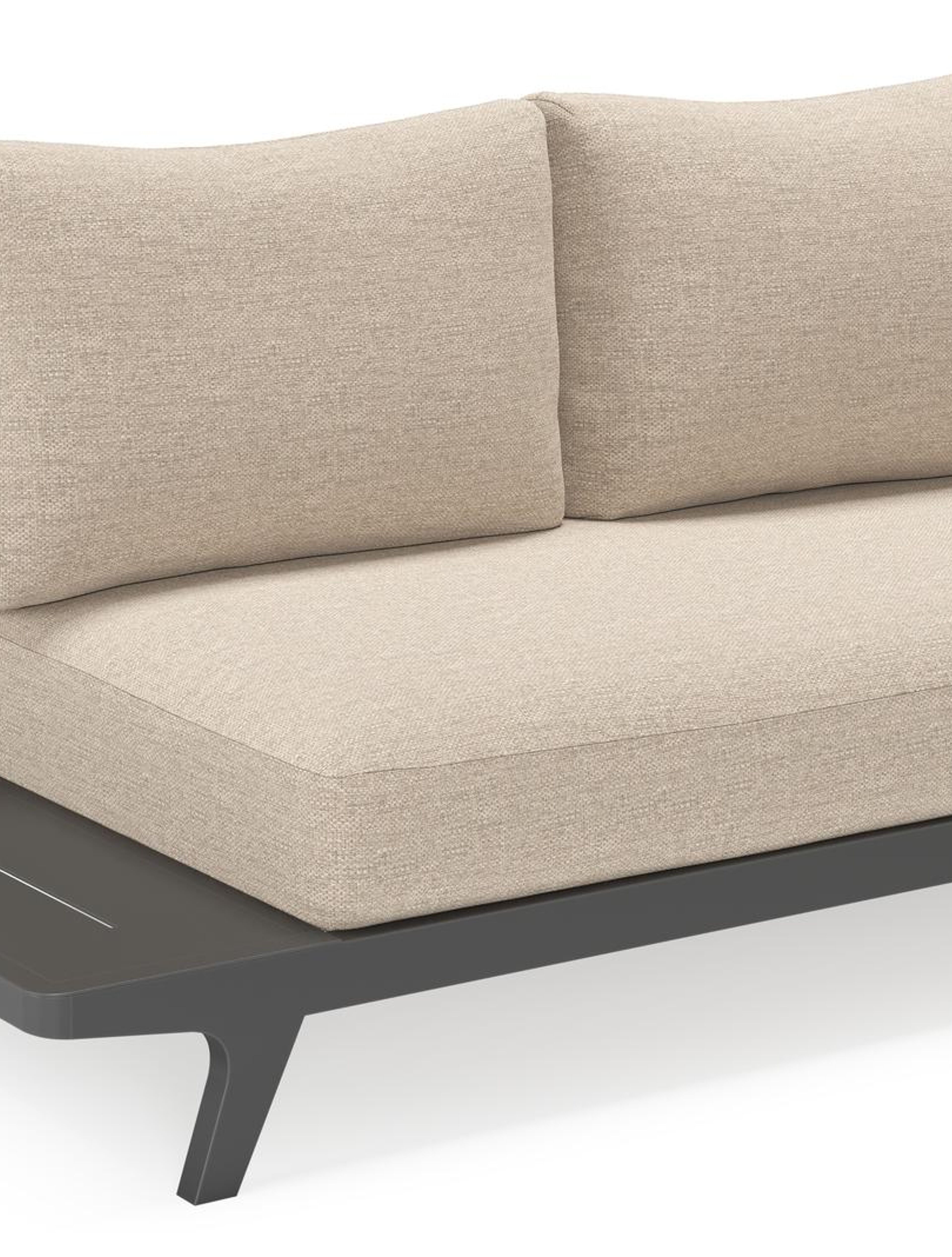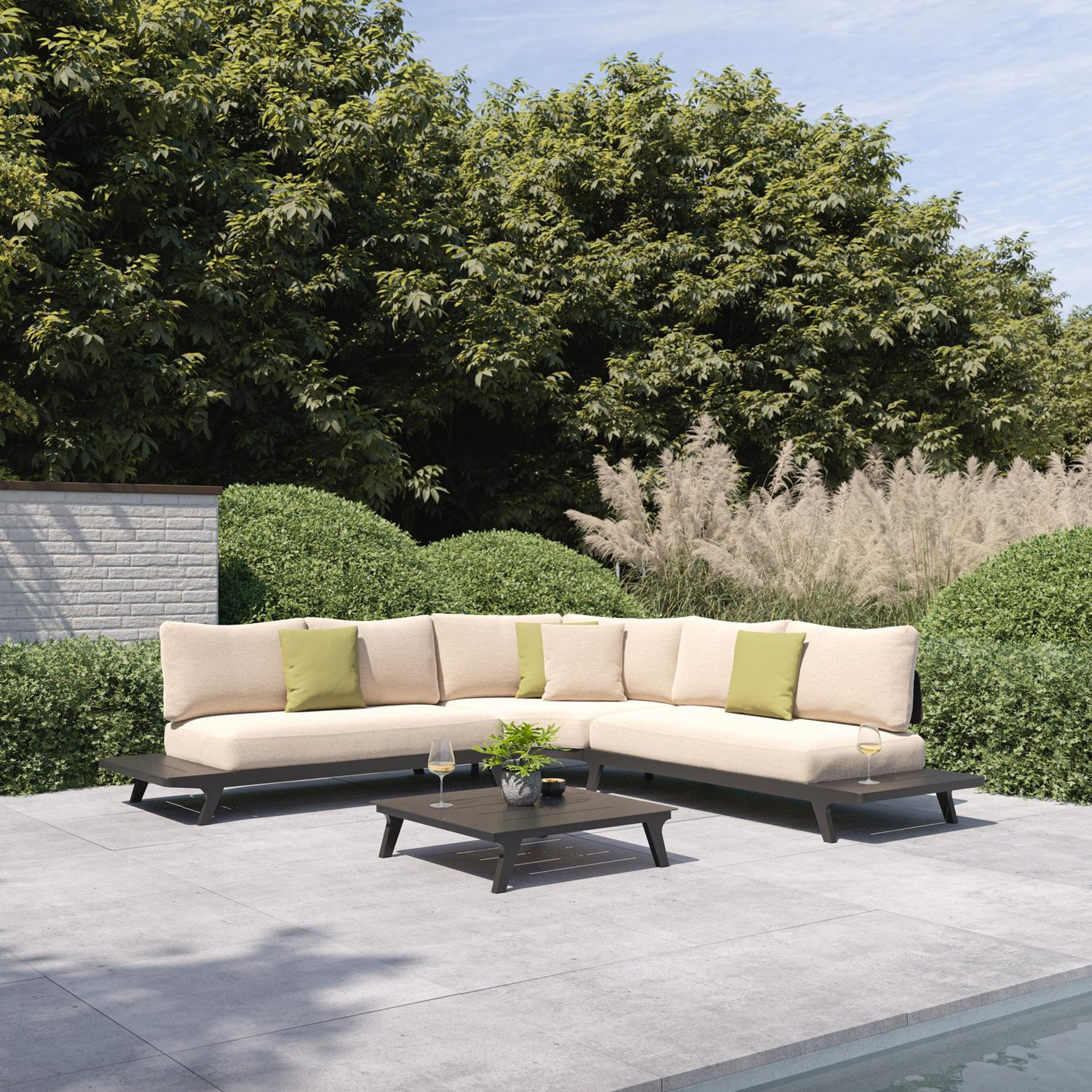 De Bolzano loungehoek heeft een moderne, strakke look met afgeronde hoeken. Het frame is gemaakt uit roestvrij aluminium, een stevig maar toch licht materiaal. De hoeken van de lounge zijn afgerond. De zijtafels zijn ook gemaakt uit aluminium. De kussens uit Weather+Softtouch, een zachte en vuilafstotende stof, zijn inclusief. Geniet van jouw onvergetelijke buitenmomenten met de kwalitatieve Bolzano hoek.