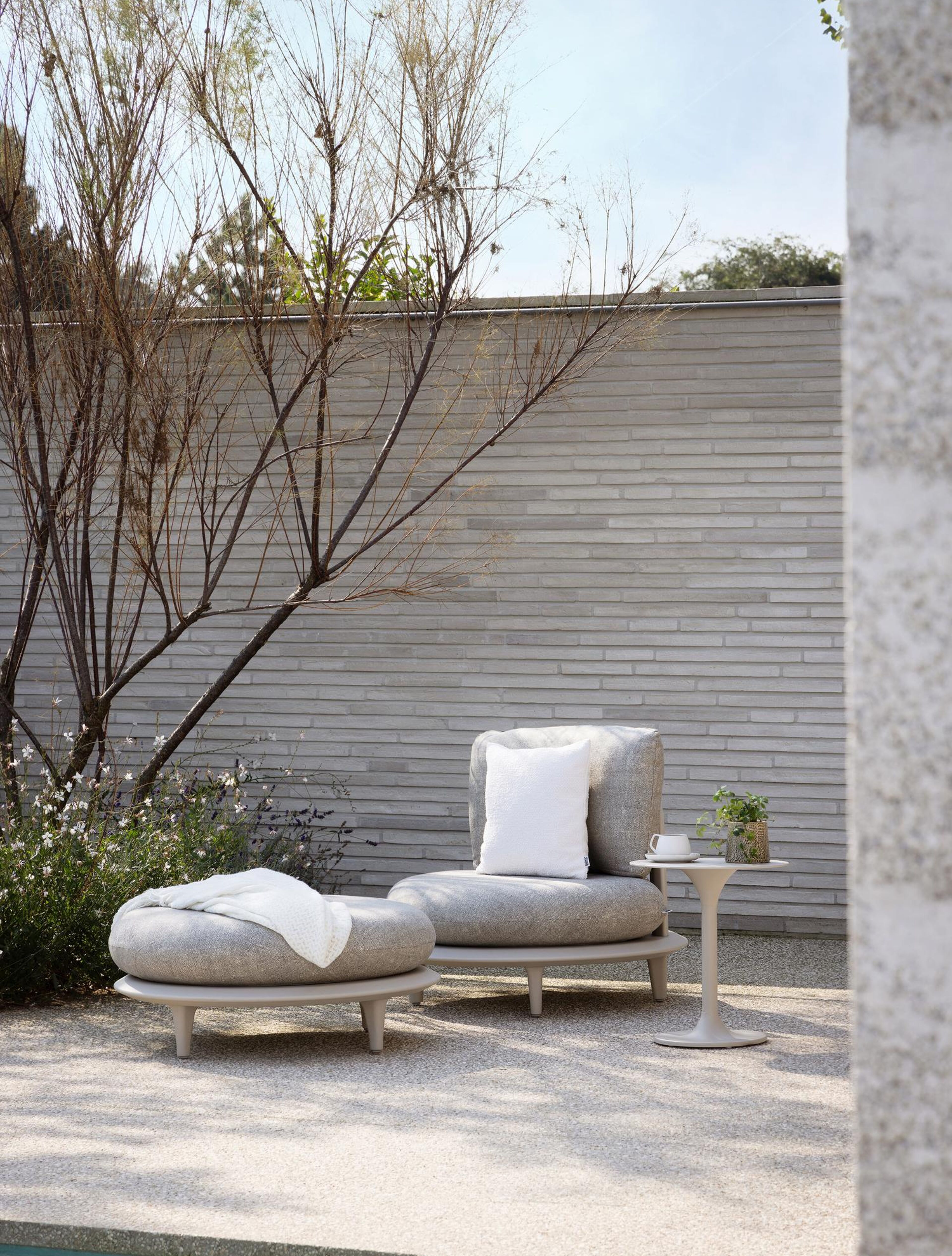 Bomero poef in beige aluminium met chartres pewter all weather sunbrella® luxe kussen | Exterioo tuinmeubelen