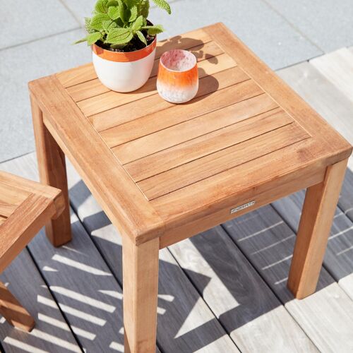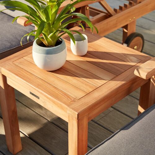 Een bijzettafel uit teak staat gelijk aan bijzondere kwaliteit en natuurlijk design. Teak is een kwalitatieve houtsoort gekenmerkt door zijn hardheid. Aangezien hout leeft, kan de structuur of kleur licht anders zijn dan op het beeld weergegeven.