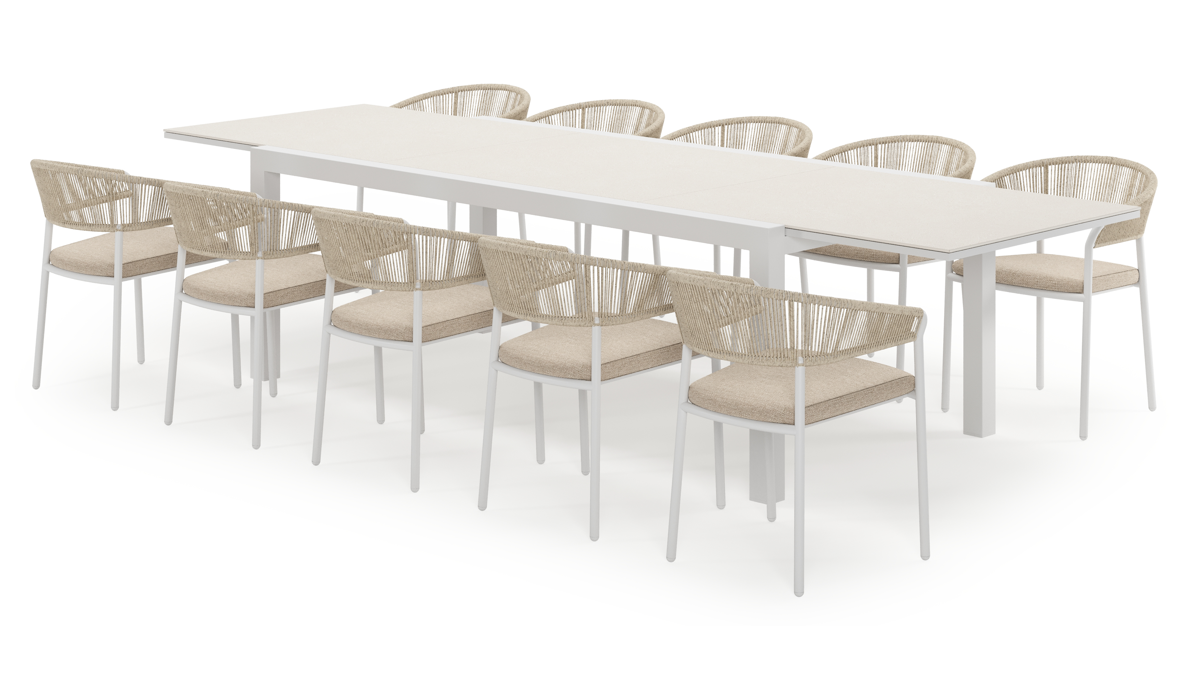 De Calobra tuinset is perfect voor een groot gezelschap en heeft een robuuste look. De tafel is verlengbaar en kan je makkelijk uitschuiven door middel van het tilt-up systeem, een systeem dat het verlengstuk in de tafel laat verdwijnen.