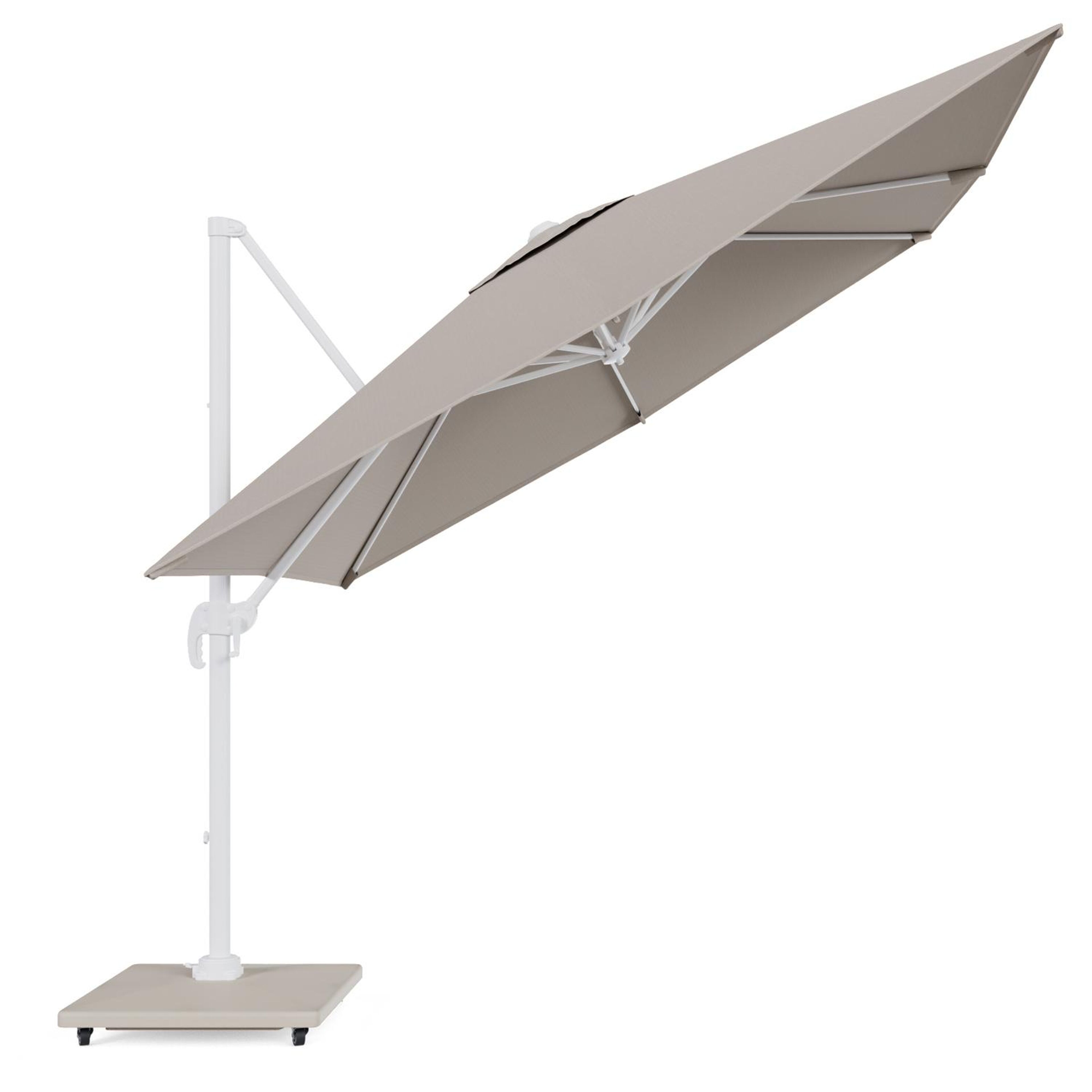 Calpe zweefparasol in wit aluminium en parasoldoek in Weather+ Softtouch Beige - L1 270 x L2 270 cm met Calpe parasolvoet 70 kg met wielen | Exterioo tuinmeubelen