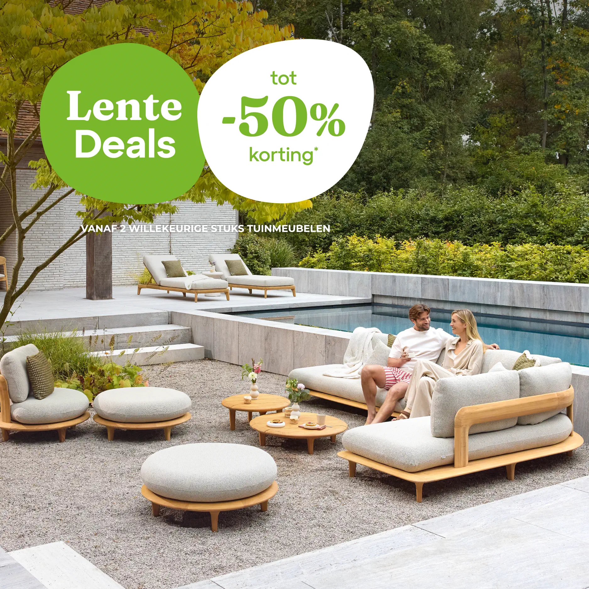 De korting geldt bij aankoop van minimaal 2 willekeurige stuks tuinmeubelen en zolang de voorraad strekt. Acties zijn onderling niet cumuleerbaar en verenigbaar met andere acties behalve met de stapelkorting. De koppelverkoop is niet geldig op accessoires, decoratie, beschermhoezen, onderhoudsproducten, verlichting, stoelkussens, ligbedkussens, sierkussens en setprijzen. Bij aankoop van minimaal 2 willekeurige stuks tuinmeubelen wordt de bijbehorende korting wel toegepast op stoelkussens en ligbedkussens. De korting wordt onmiddellijk verrekend in je winkelmandje.