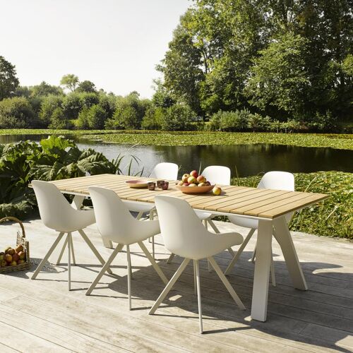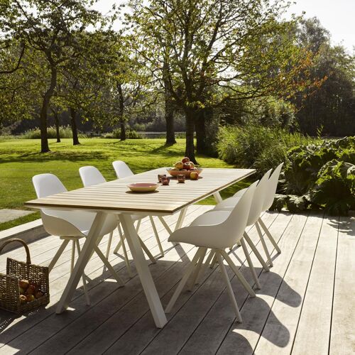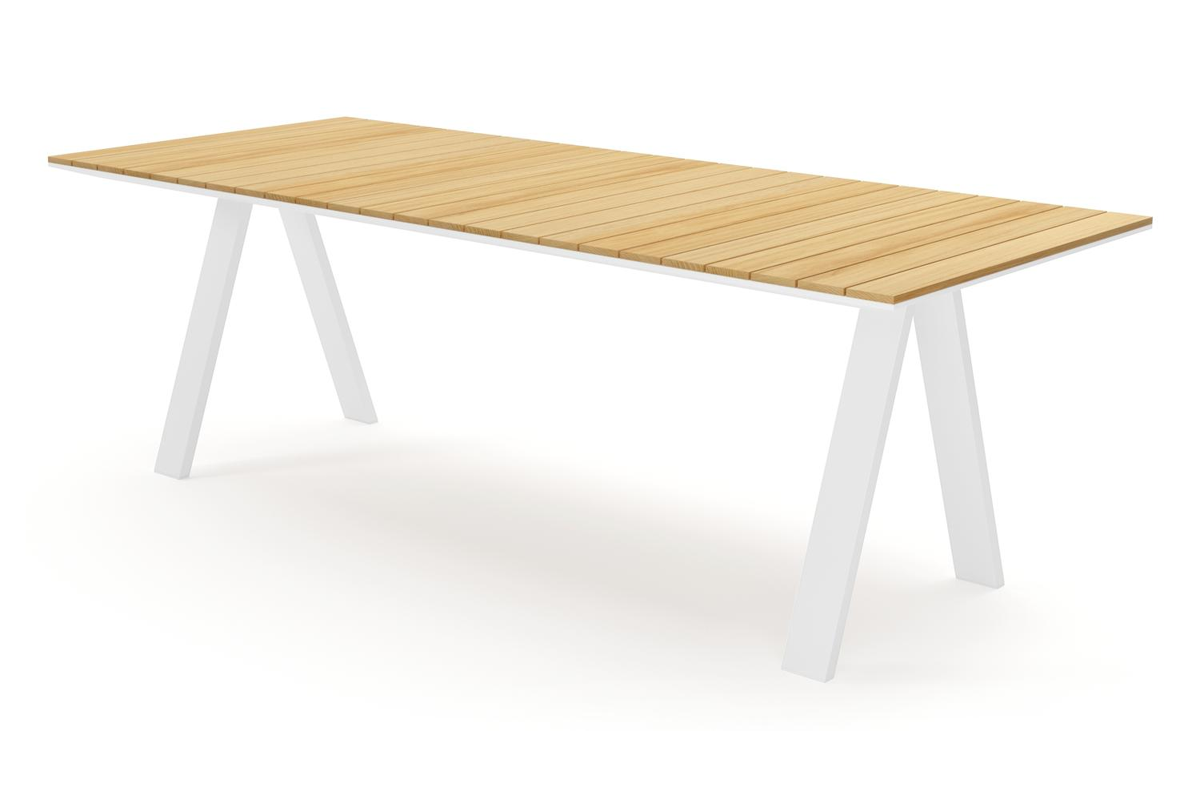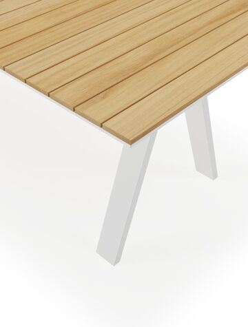 De Cesano tafel is herkenbaar aan zijn stijlvol onderstel met omgekeerde V-poten. Het frame is gemaakt van aluminium een licht, maar sterk en roestvrij materiaal dat zeer geschikt is voor tuinmeubelen. Deze tafel is afgewerkt met een tafelblad in teak. Dit zorgt voor een warme en natuurlijke touch.