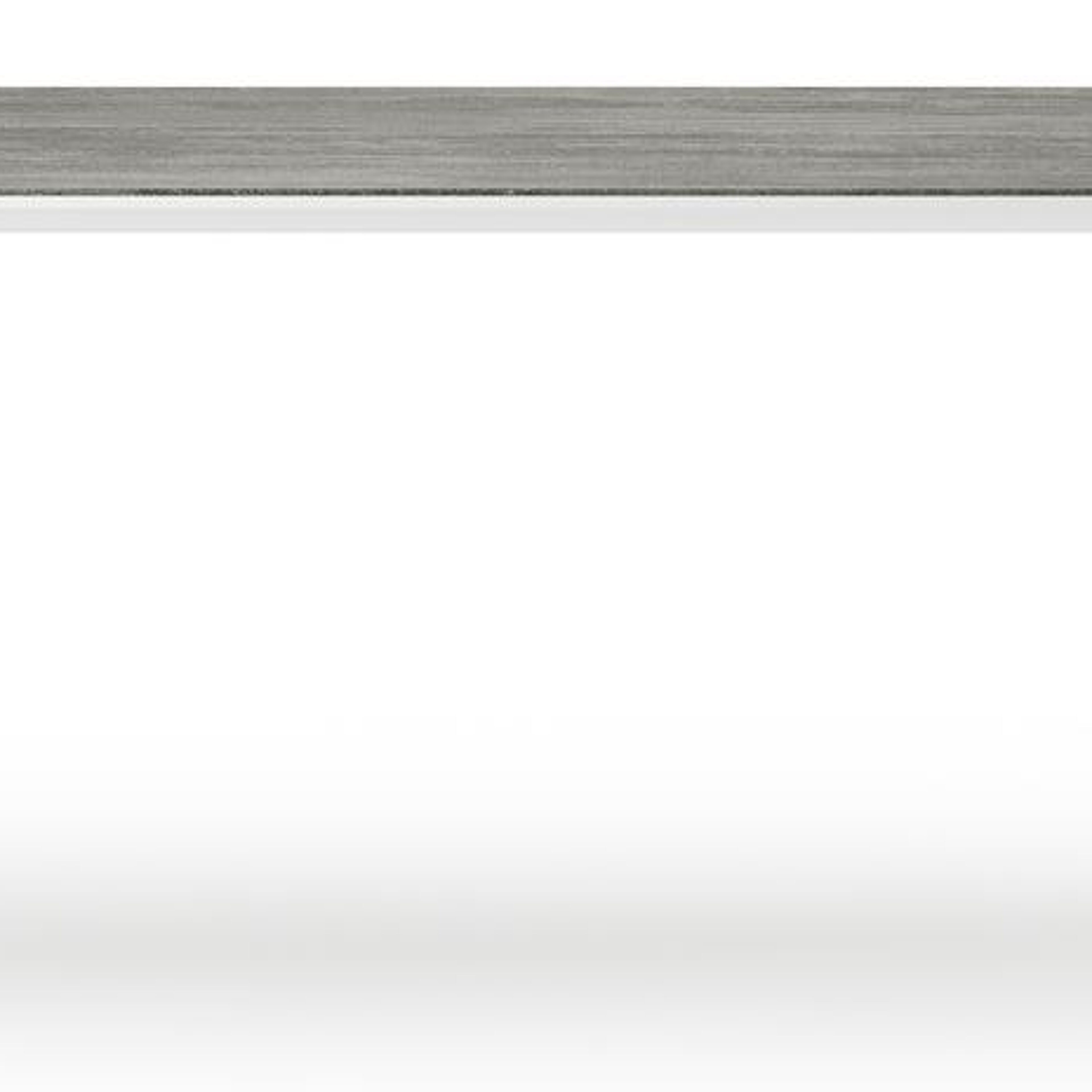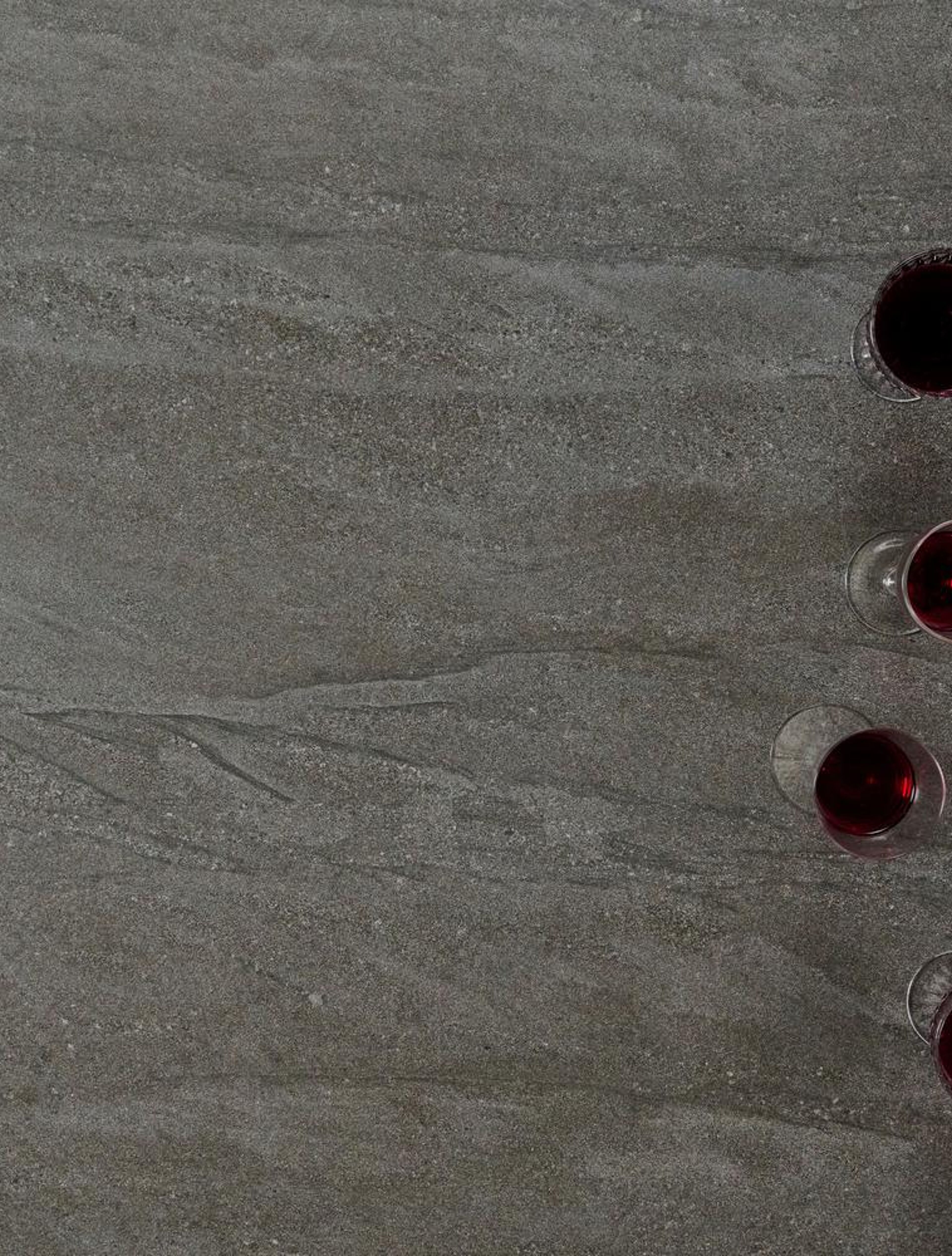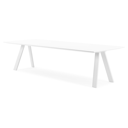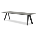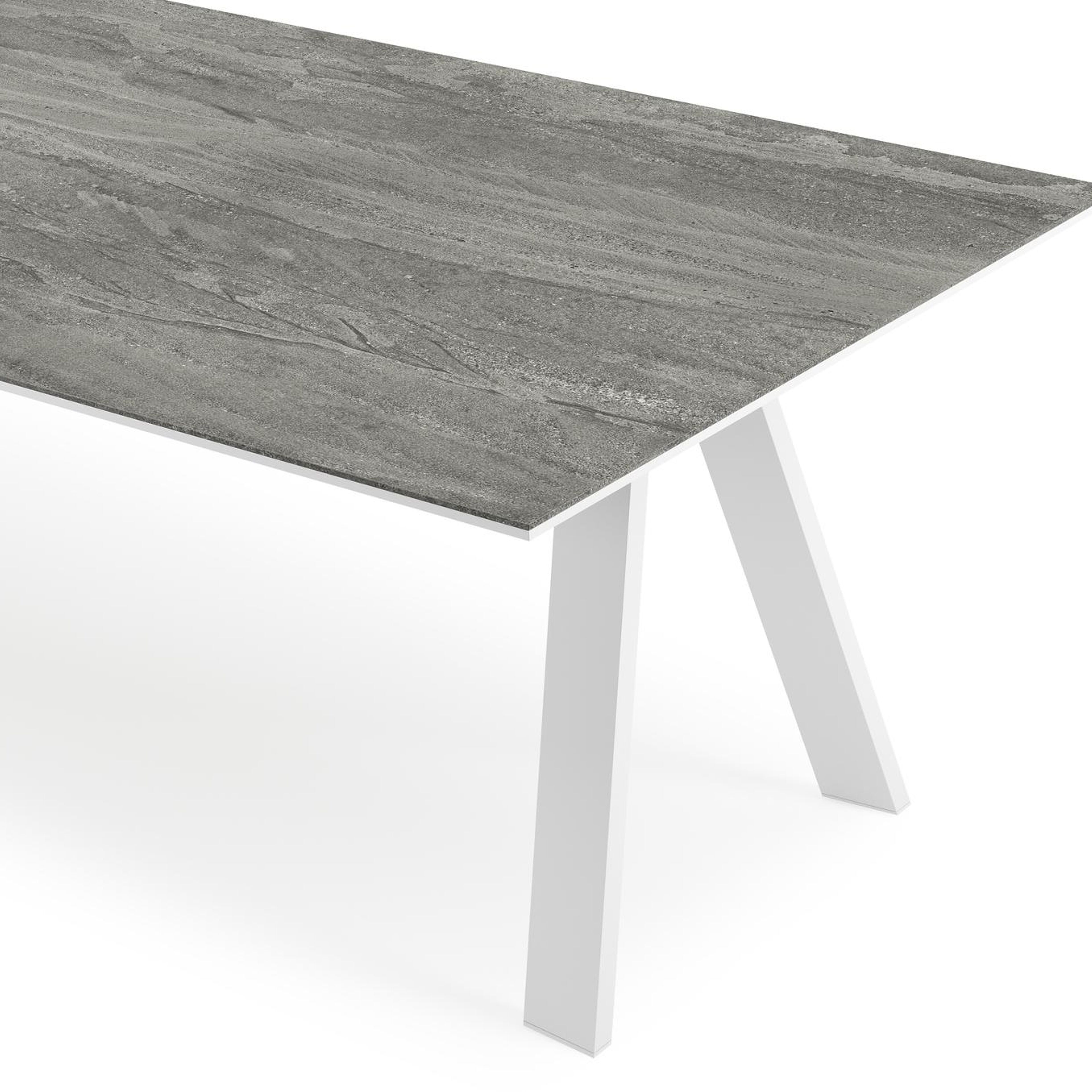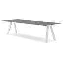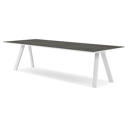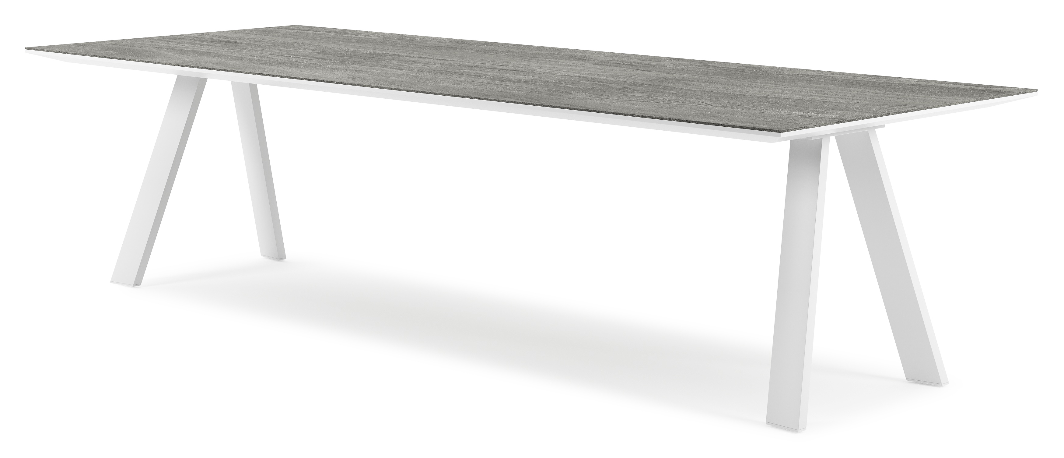 Onderstel Cesano in aluminium, wit, gecombineerd met een tafelblad in keramisch (aspen grey). Dikte blad: 6 mm. L 280 x B 110 cm.