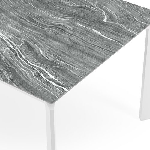 De Cirello tafel heeft een modern design. De tafelpoten staan inwaarts gericht naar het middelpunt van de tafel. Bovendien zorgt het frame ervoor dat het tafelblad zweeft boven het frame. Het frame is gemaakt van aluminium een licht, maar sterk en roestvrij materiaal dat zeer geschikt is voor tuinmeubelen. Deze tafel is afgewerkt met een Mar Del Plata tafelblad. Een uniek tafelblad waarin de golven van de zee weerspiegelen. In de tafel vind je glinsterende spikkels die zorgen voor een prachtig parelmoereffect. Het voordeel van volkeramische tafelbladen is dat ze krasbestendig zijn en bestand zijn tegen alle weersomstandigheden.