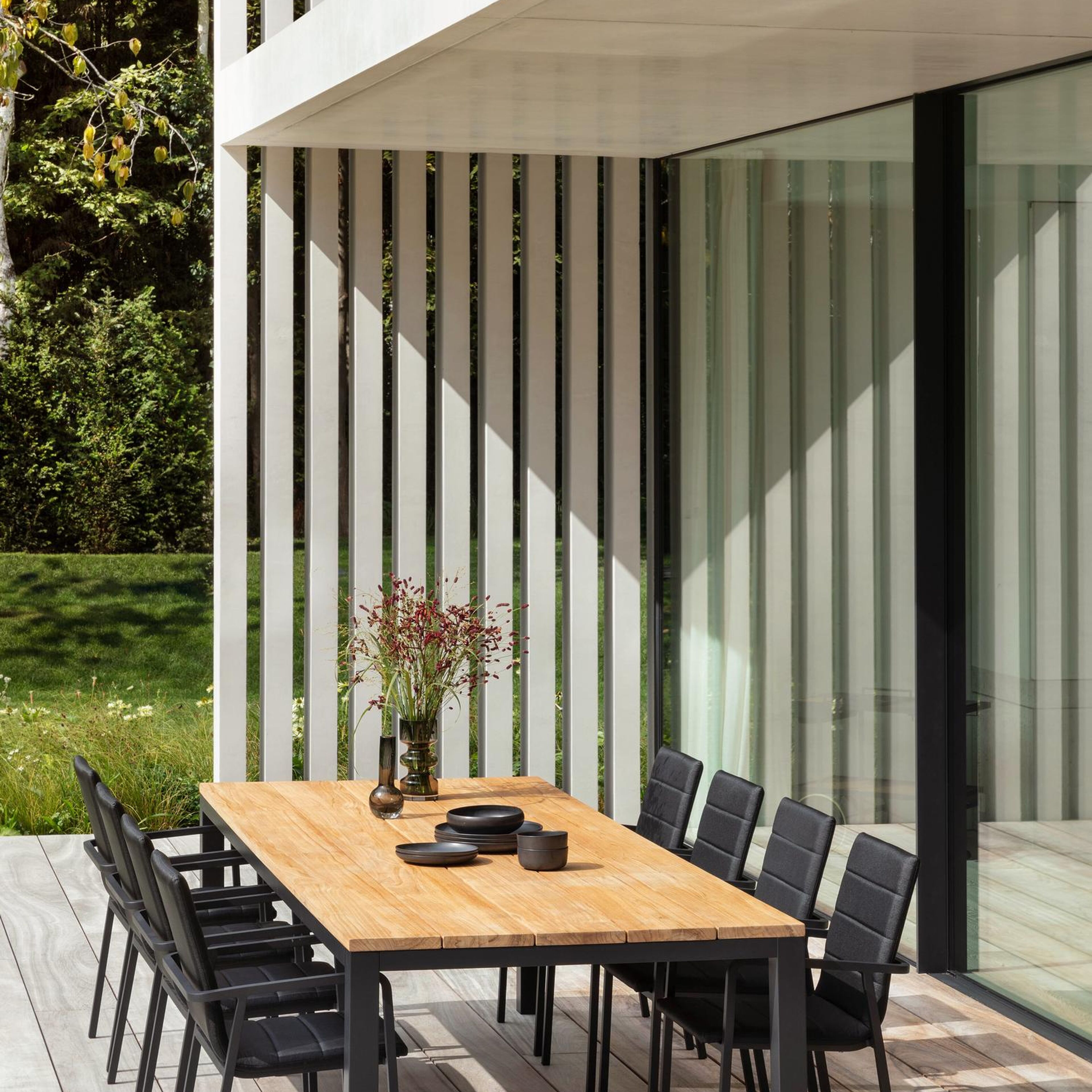 De Como tuintafel heeft een robuust en minimalistisch design door de blokvormige poten en strakke uitlijning van het frame. Dit eigentijdse karakter geeft de tafel een modern tint.