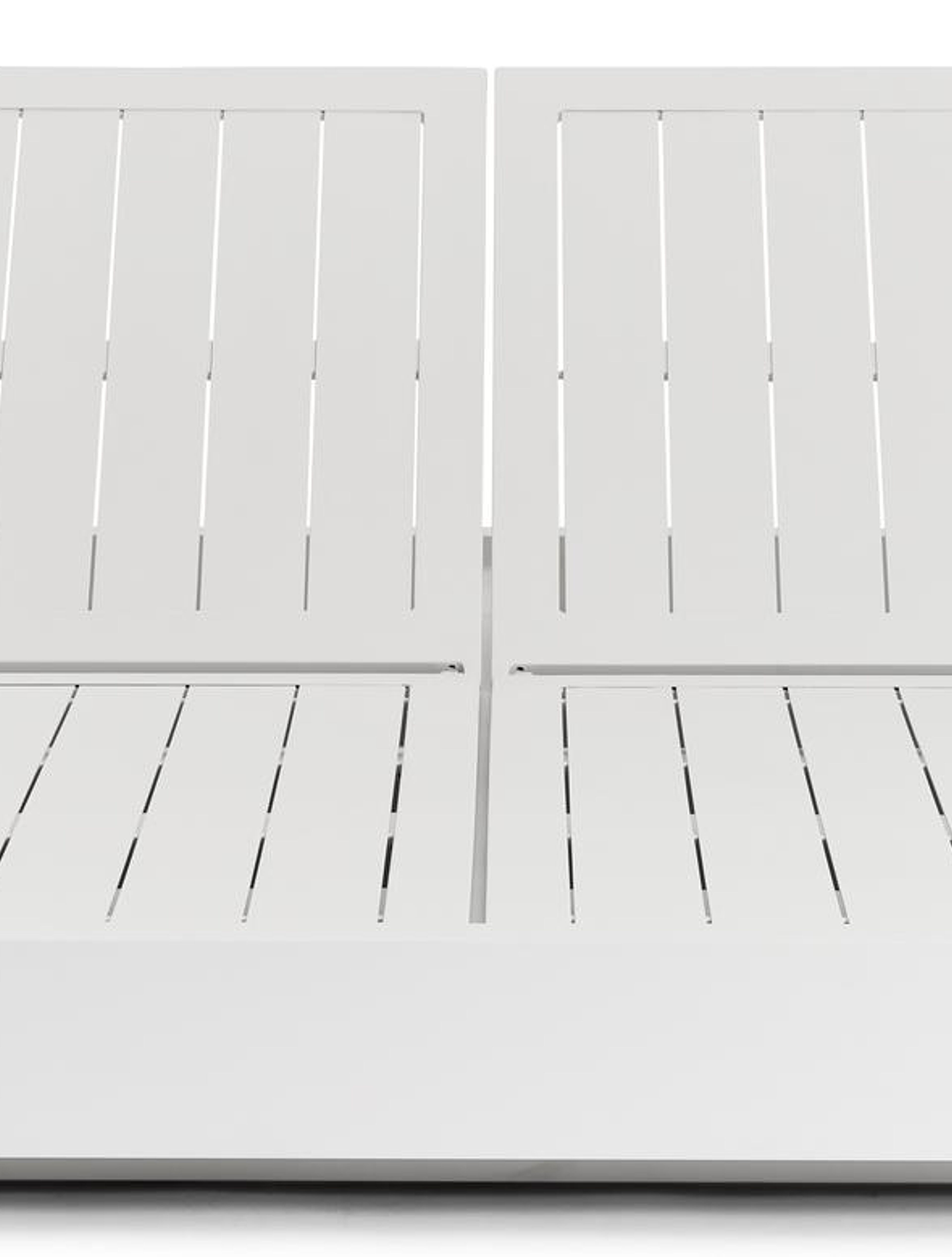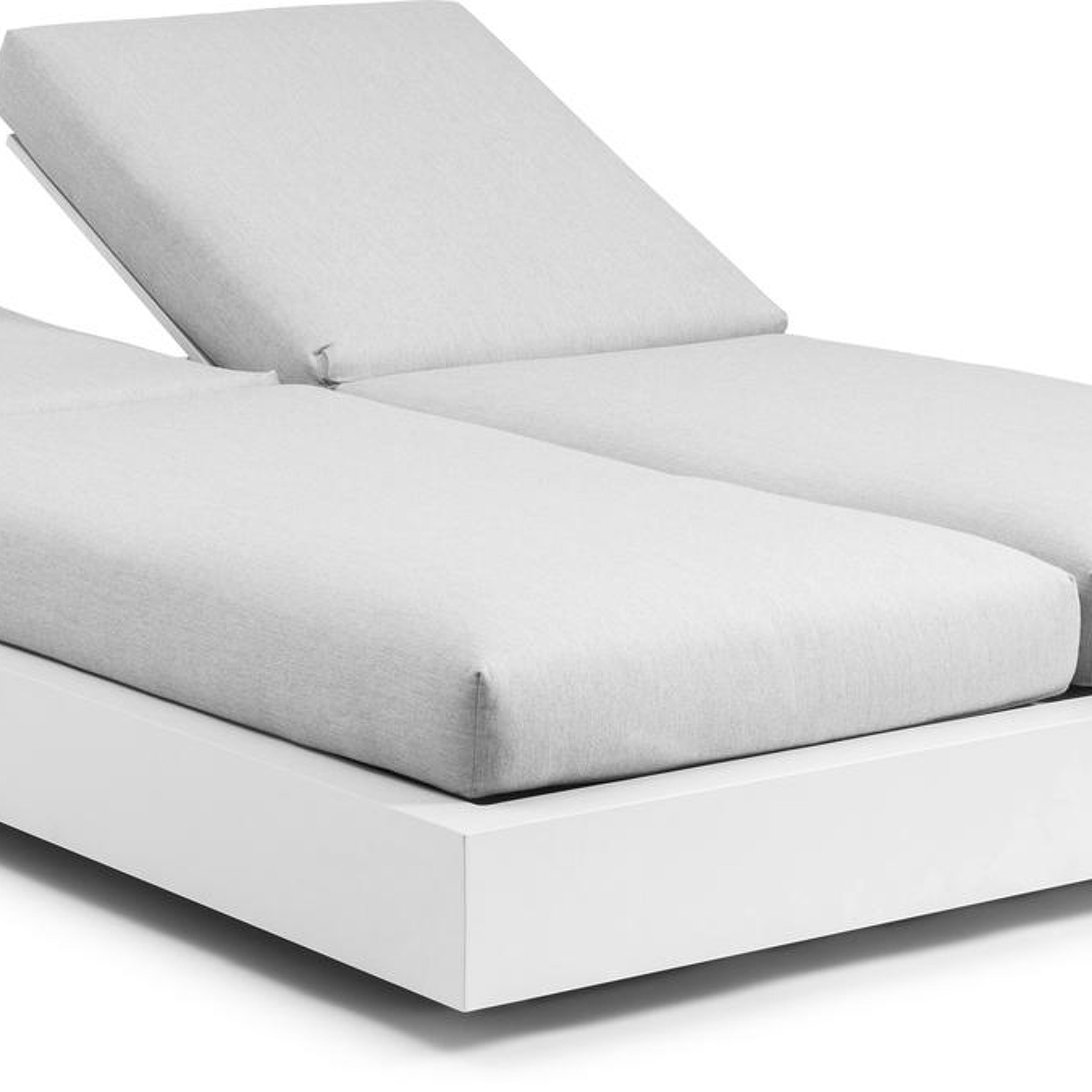Dubbel ligbed in wit mat aluminium. Met verstelbare rugleuning. L 211 x B 147,4 x H 25 cm. Met kussens in All Weather kwaliteit: waterbestendige Sunbrella® stof en vulling met Quick Dry Foam. Kleur: Natte Grey Chine. Afmeting: L 205 x B 70 cm.