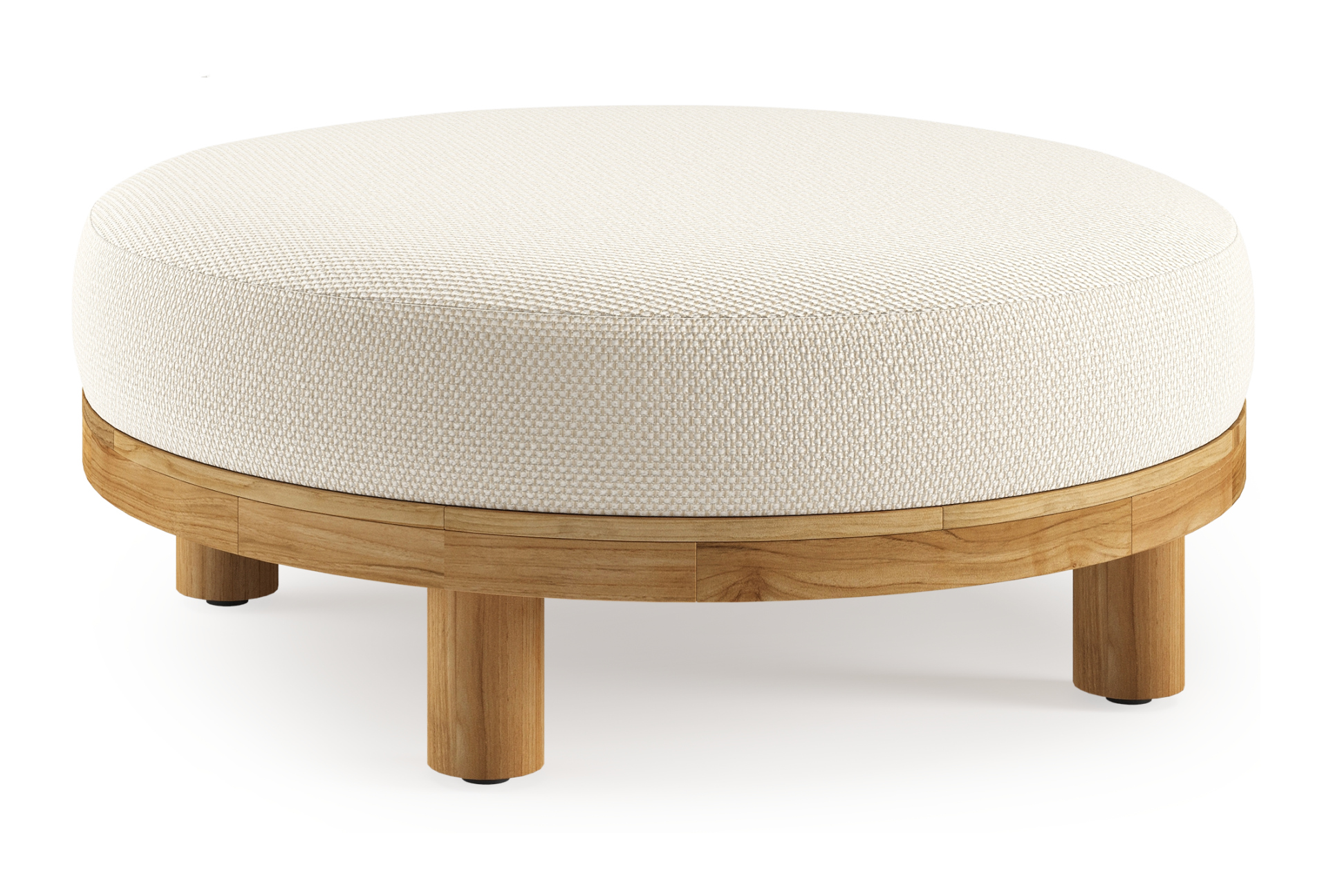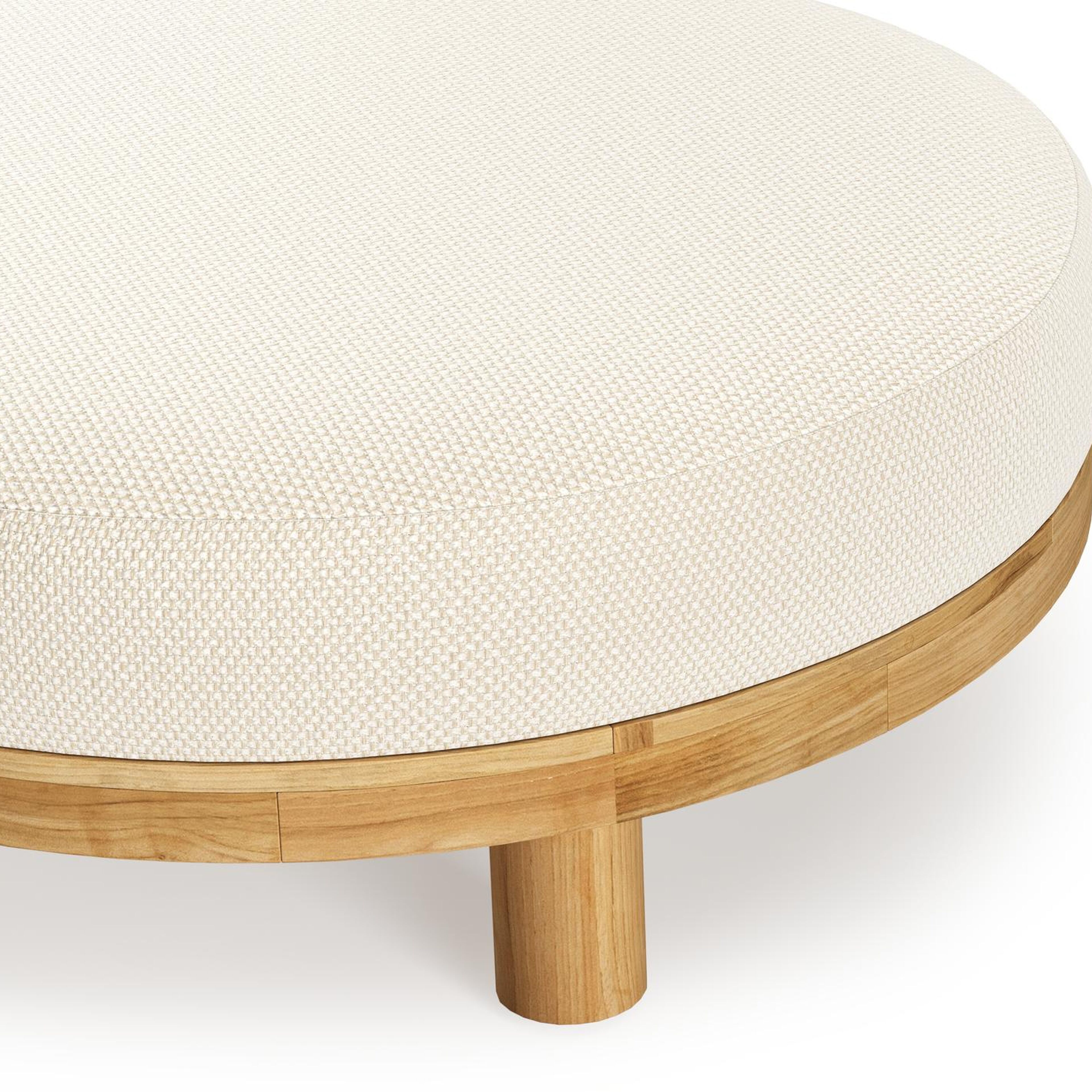 Donato lounge poef in teak en beige verticaal geweven ronde rope met all weather cosytica Althea Off White kussen | Exterioo tuinmeubelen