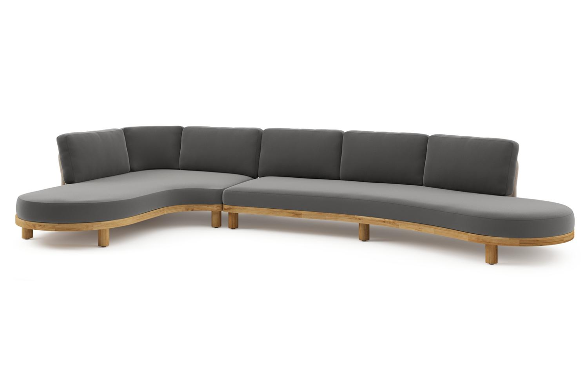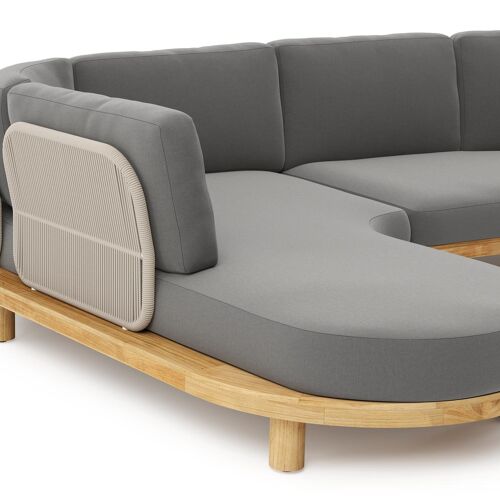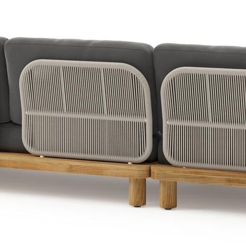 Donato loungehoek in teak en beige verticaal geweven ronde rope met all weather sunbrella® luxe Natte Charcoal Chine kussen | Exterioo