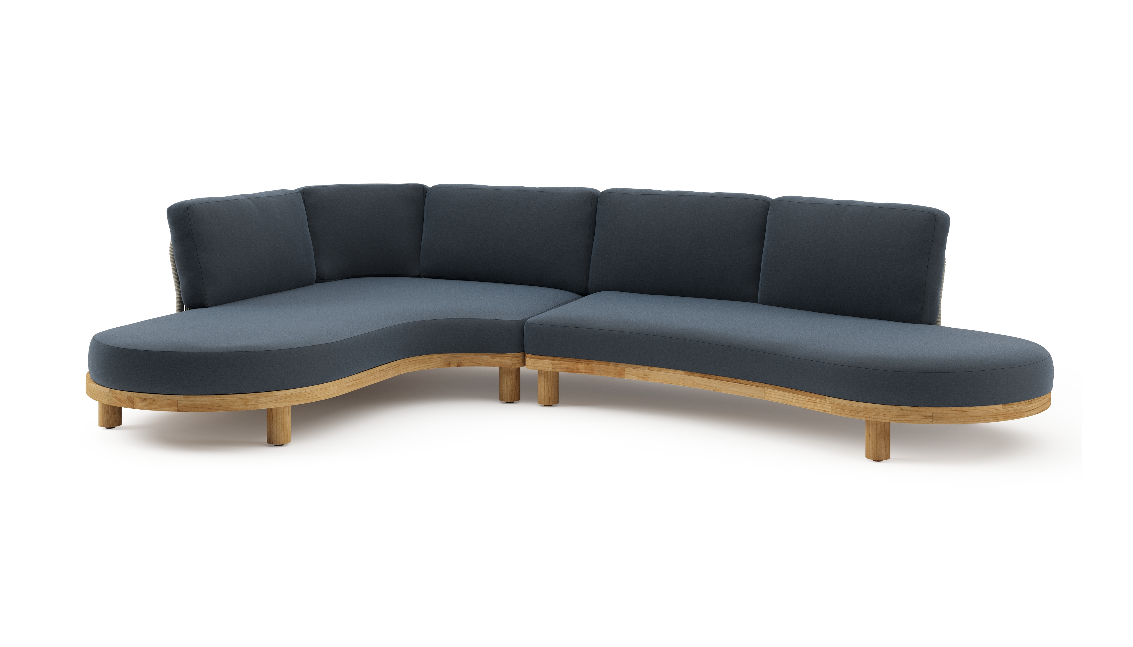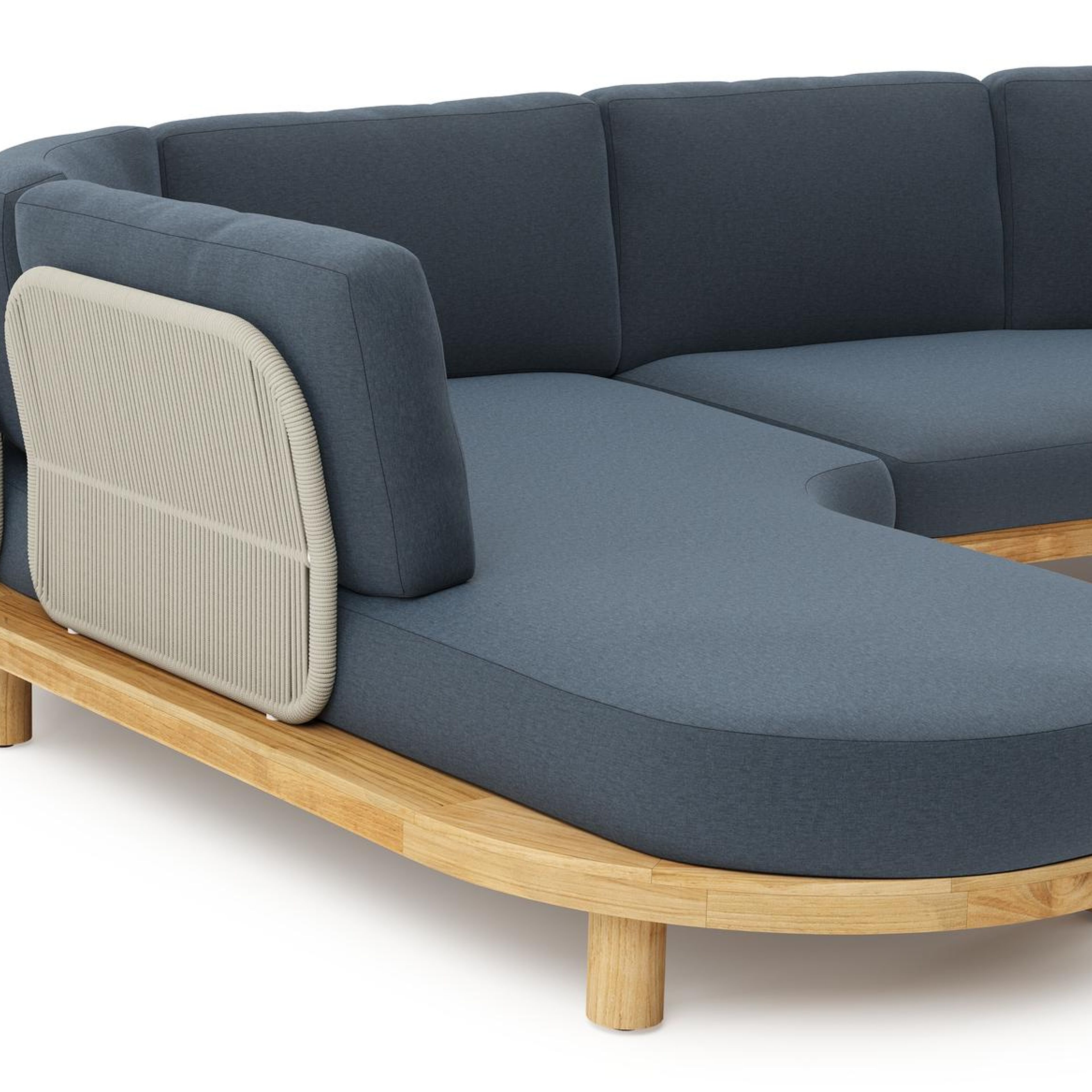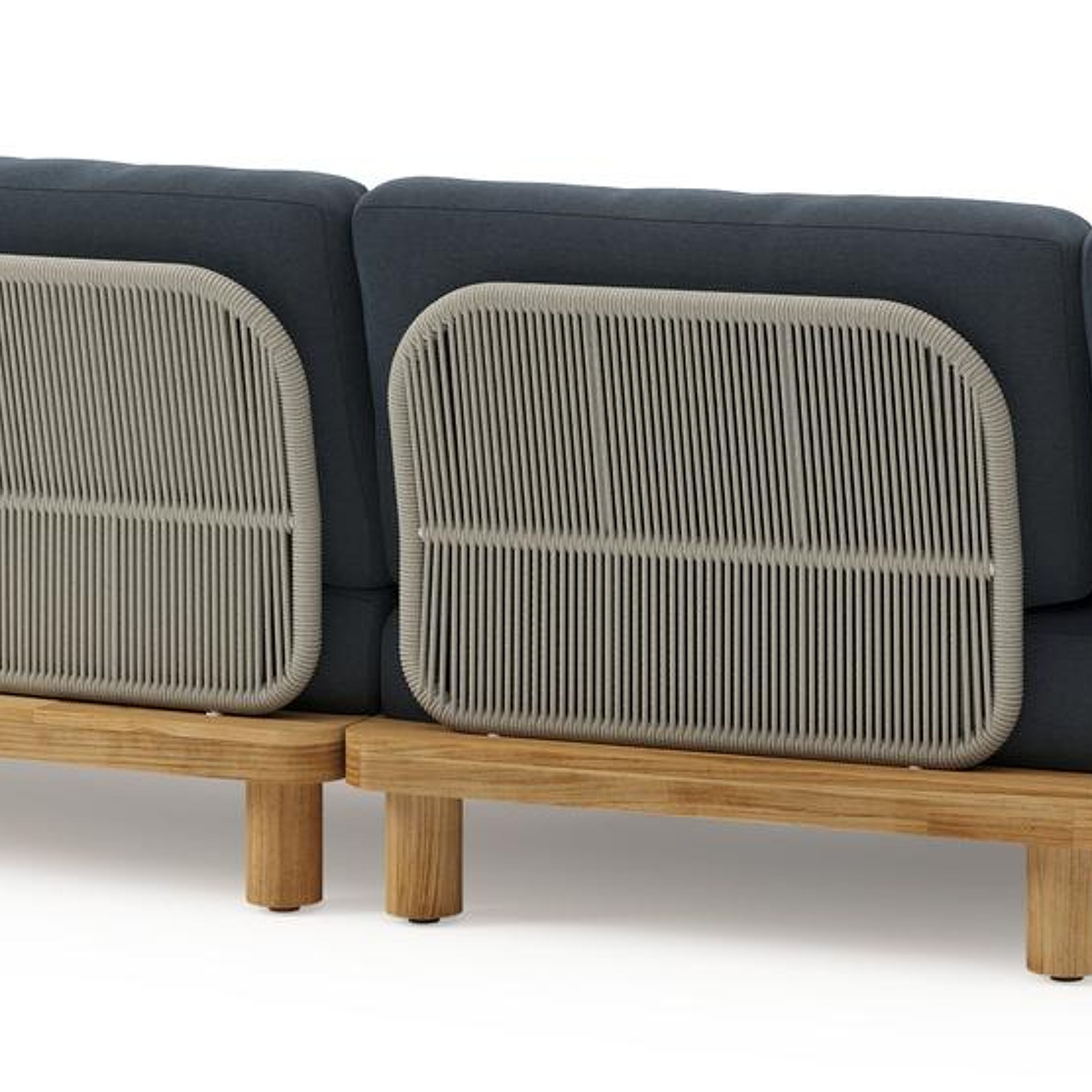 Donato loungehoek in teak en beige verticaal geweven ronde rope met all weather sunbrella® luxe Heritage Indigo kussen | Exterioo tuinmeubelen