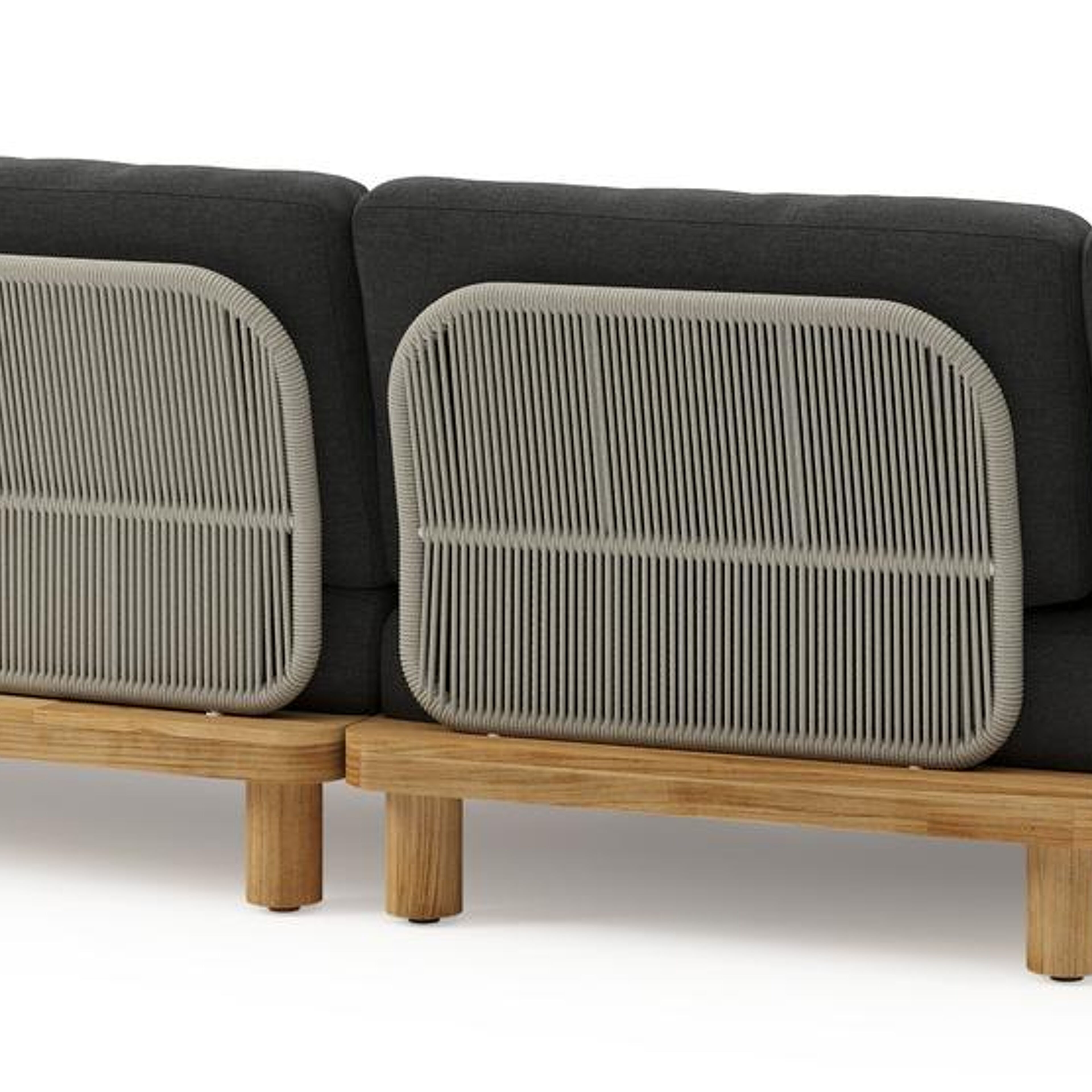 Donato loungehoek in teak en beige verticaal geweven ronde rope met all weather sunbrella® luxe Chartres Sooty kussen | Exterioo tuinmeubelen