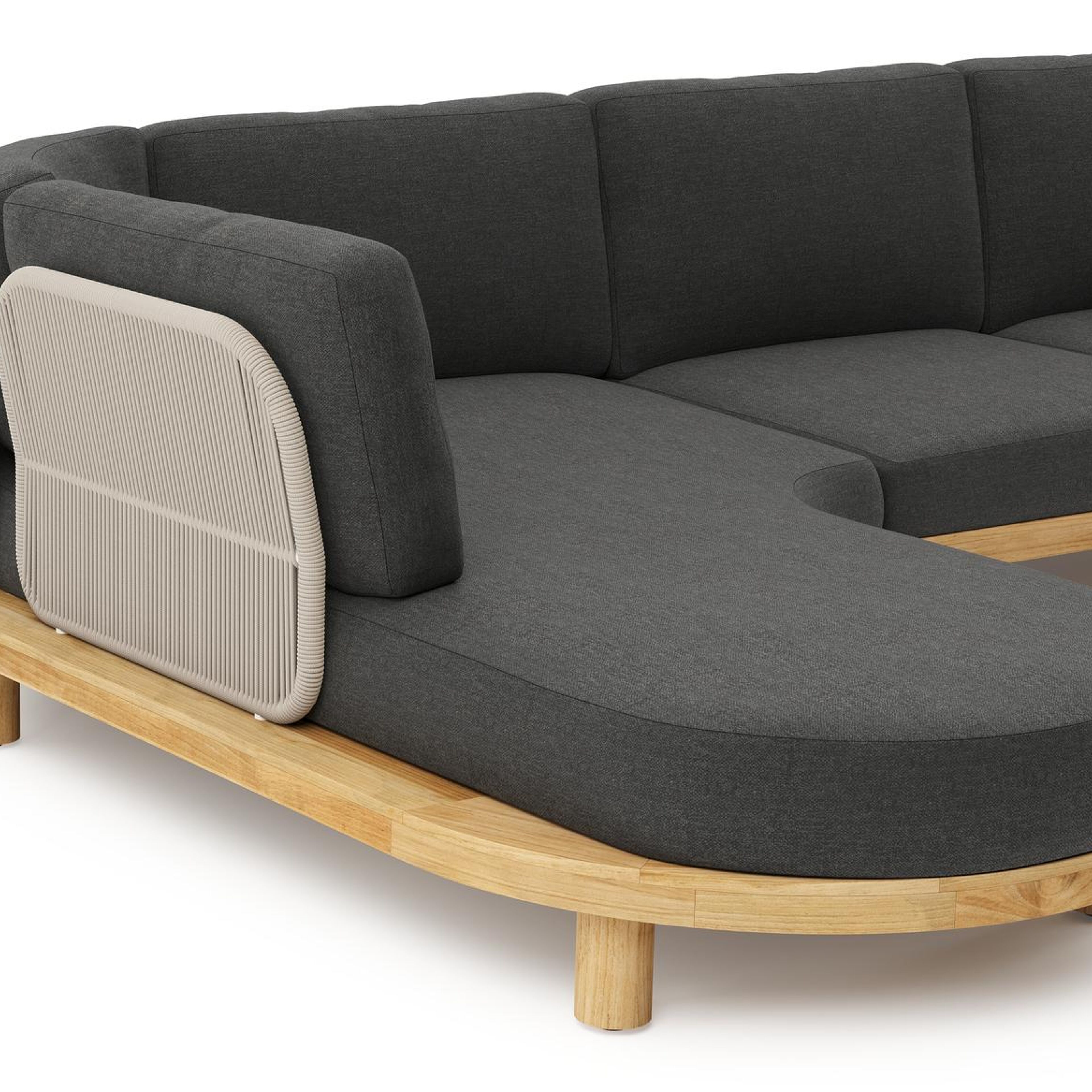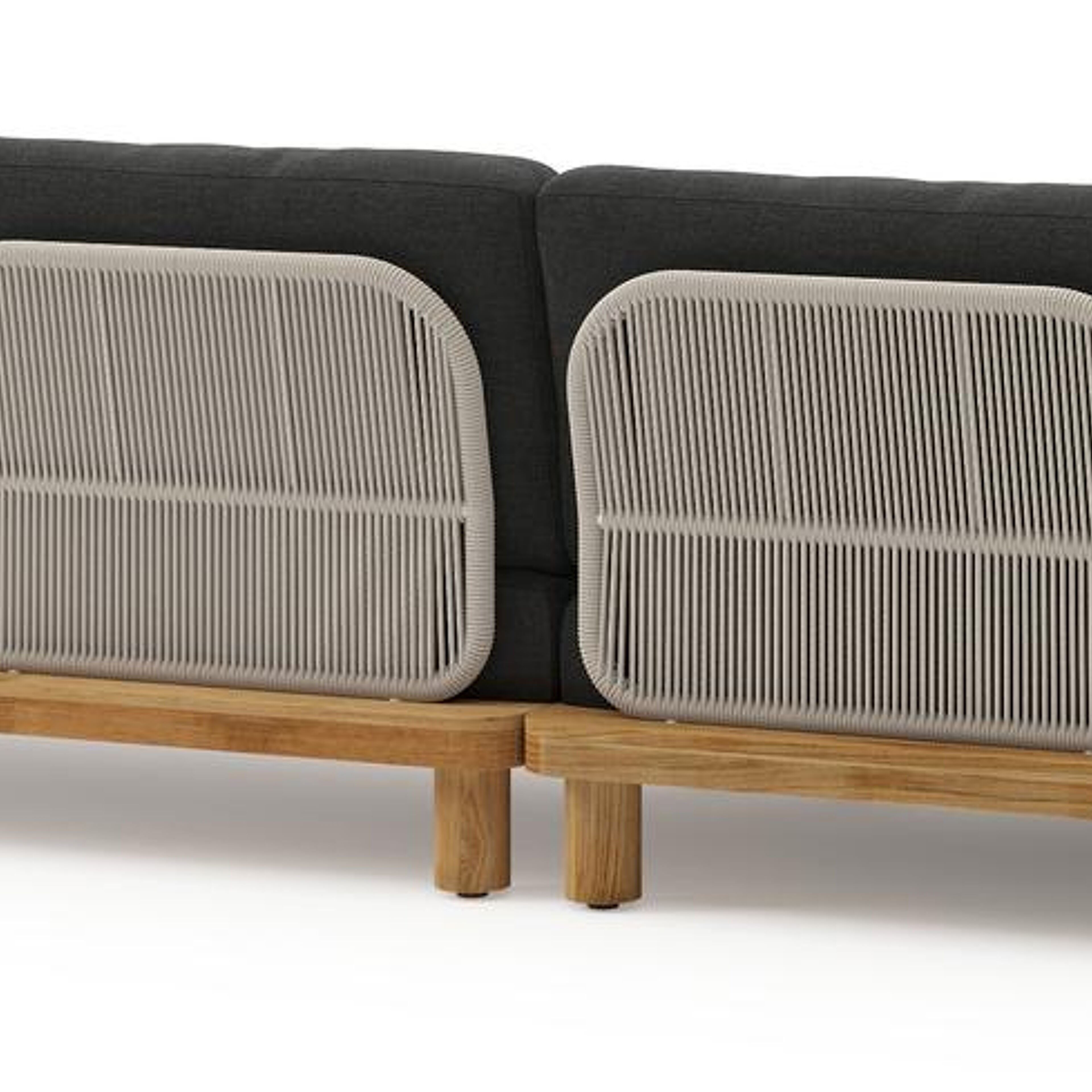 Donato loungehoek in teak en beige verticaal geweven ronde rope met all weather sunbrella® luxe Chartres Sooty kussen | Exterioo tuinmeubelen
