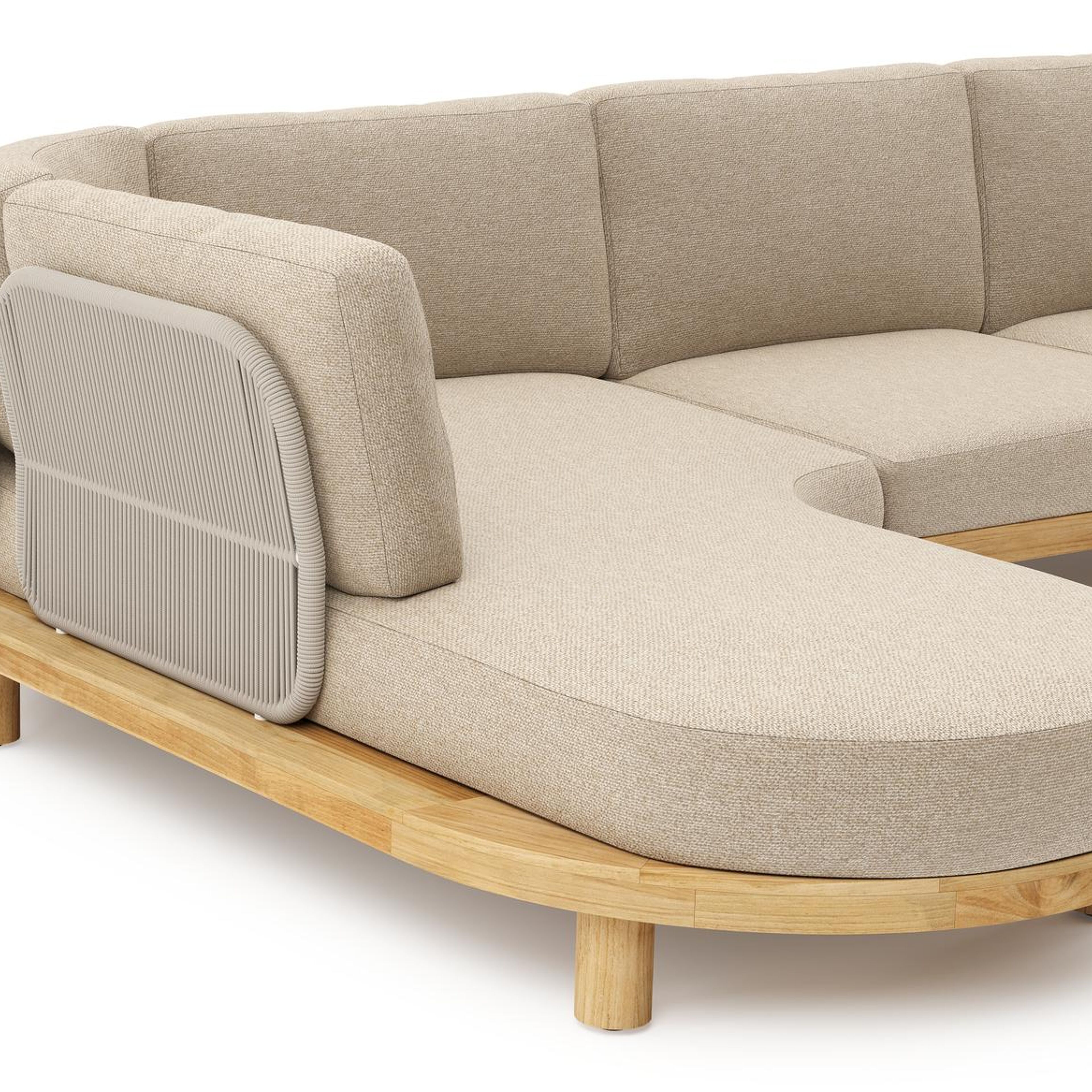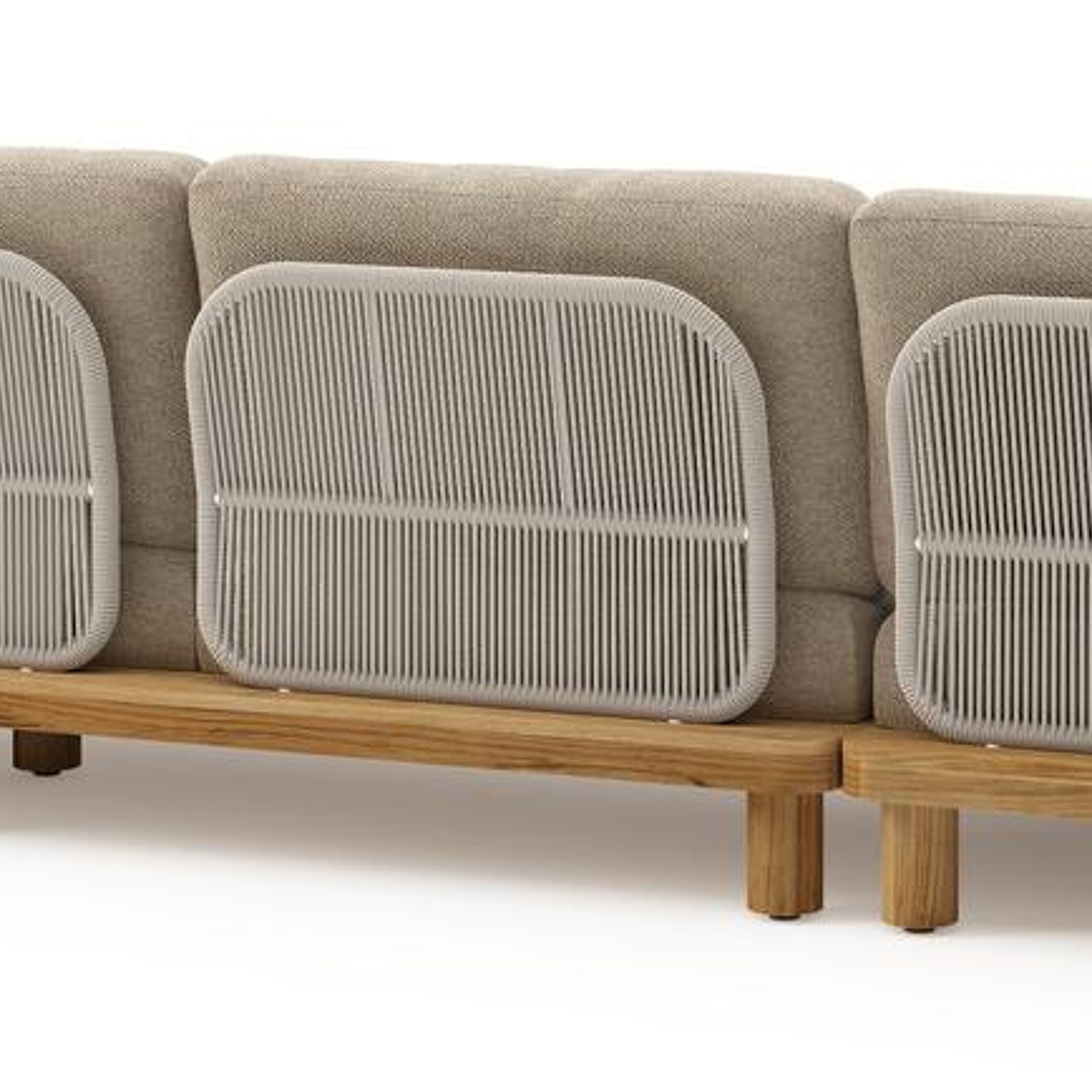Donato loungehoek in teak en beige verticaal geweven ronde rope met all weather cosytica Madagascar Oak kussen | Exterioo tuinmeubelen