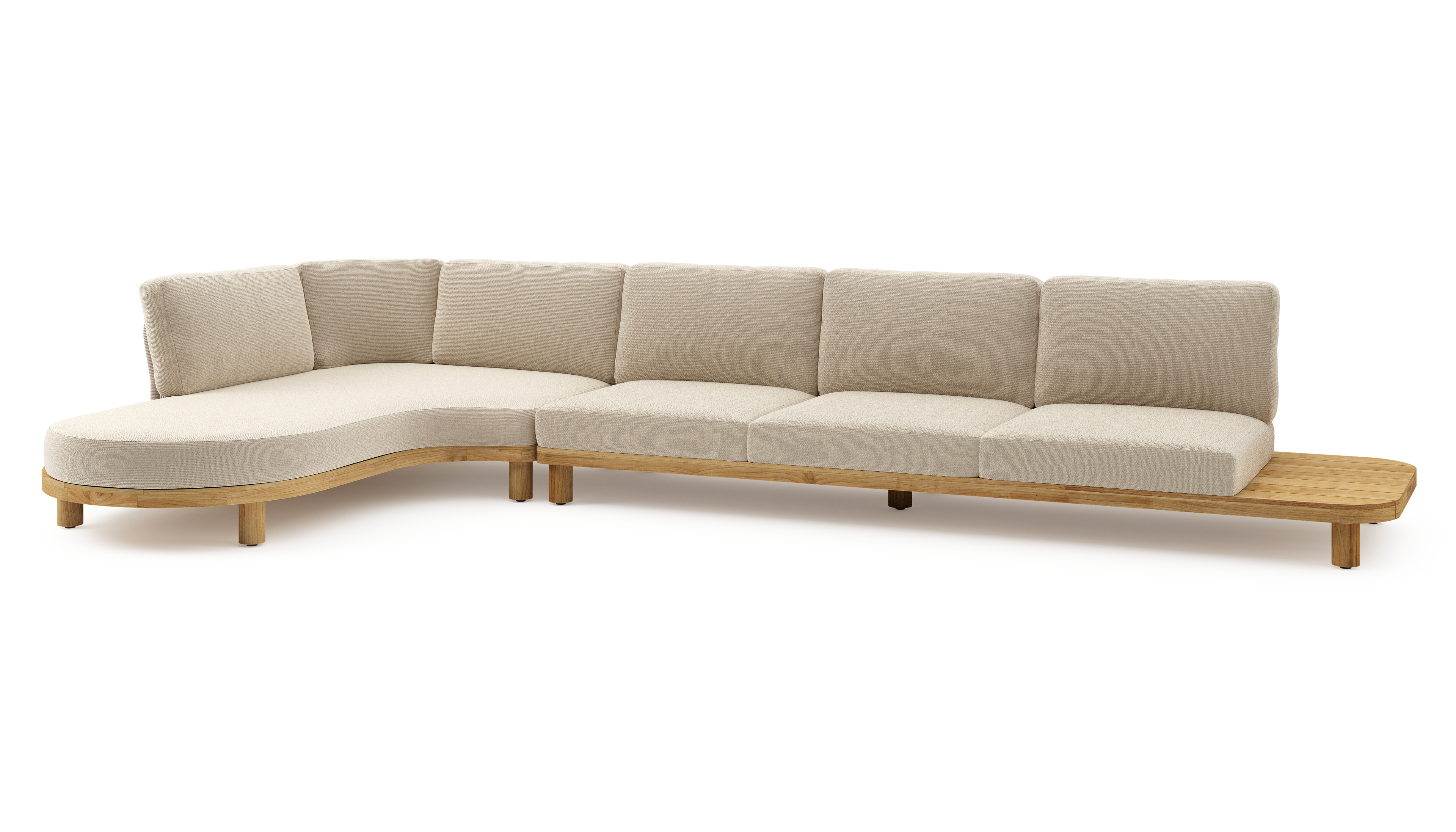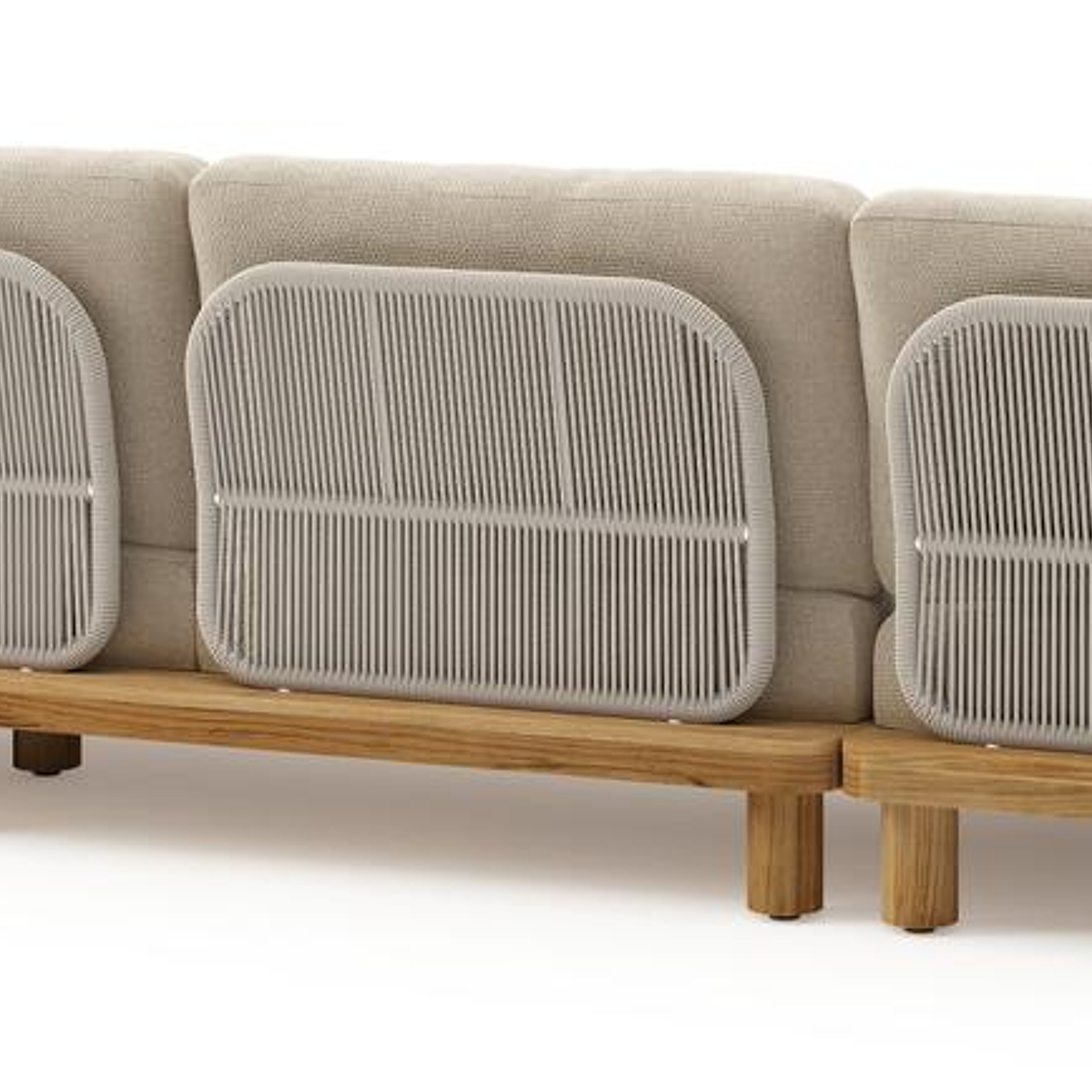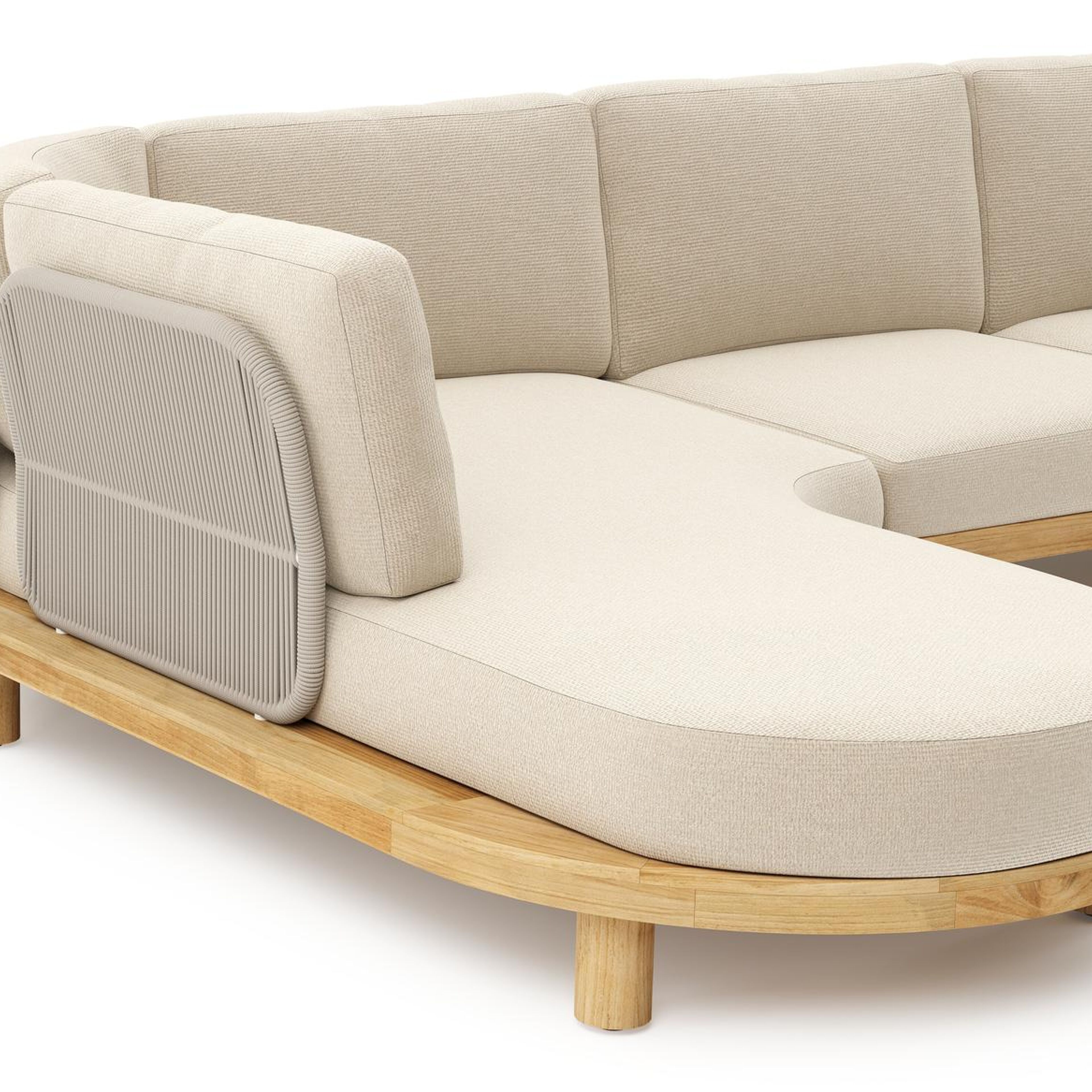 Donato loungehoek in teak en beige verticaal geweven ronde rope met all weather cosytica Althea Chalk kussen | Exterioo tuinmeubelen
