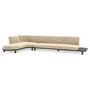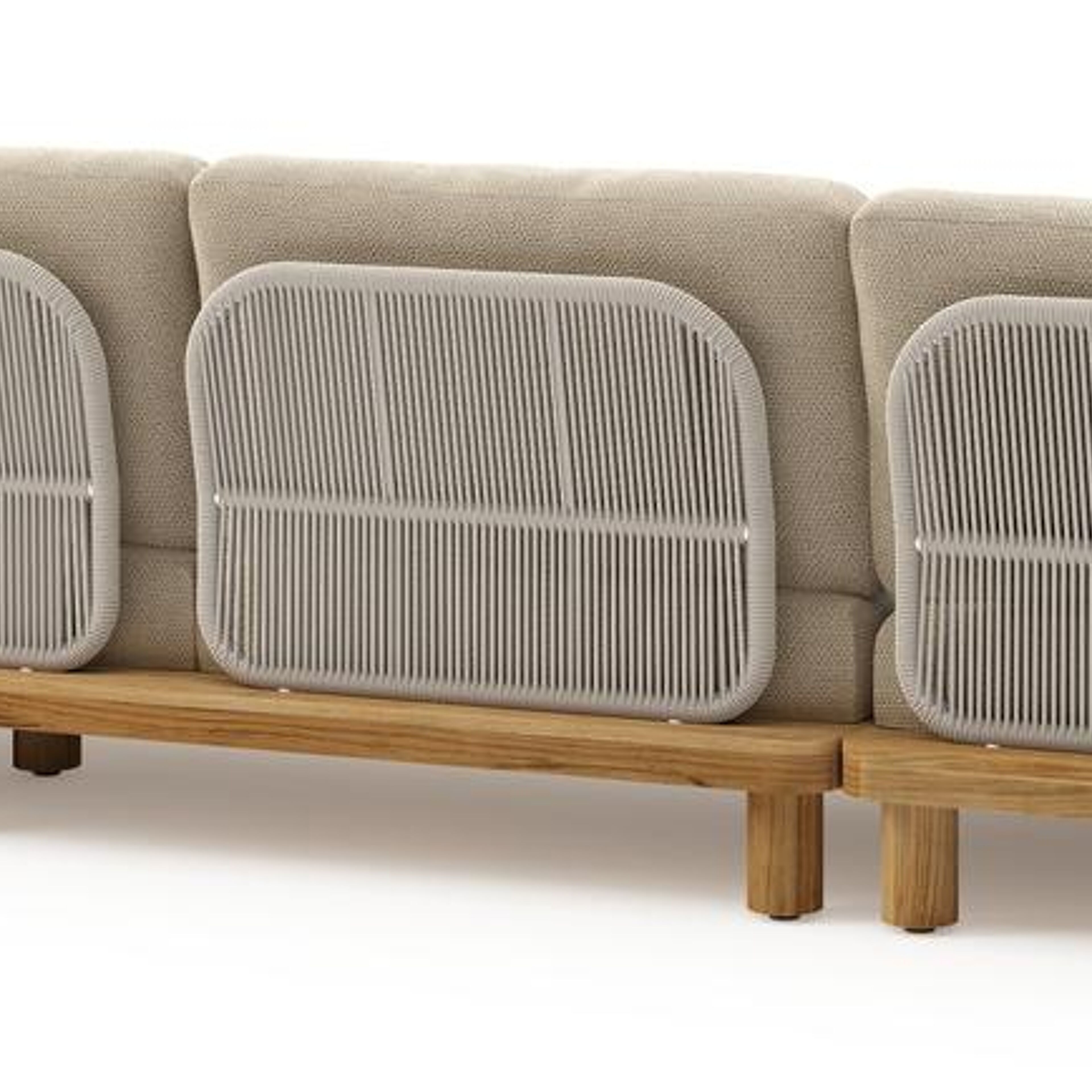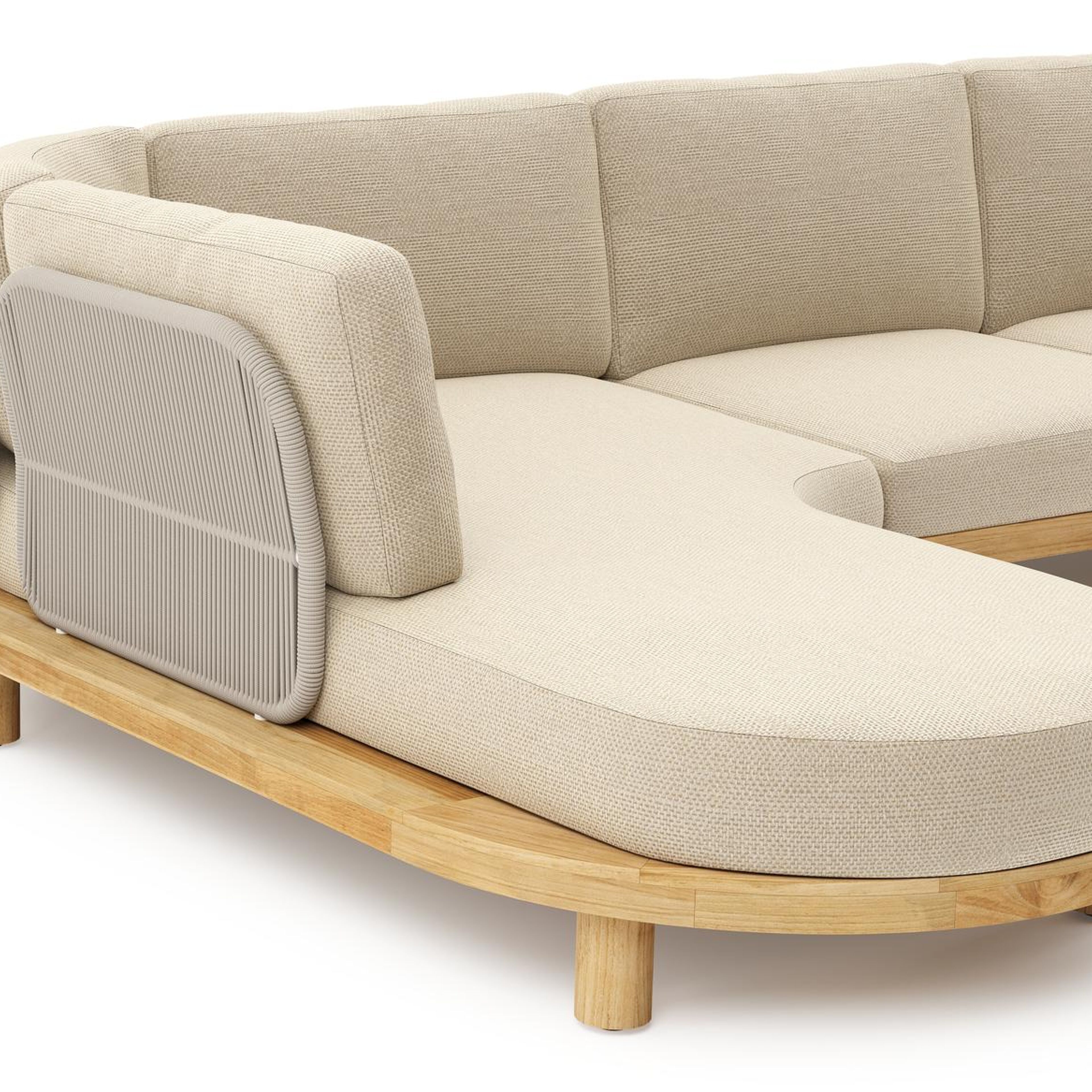 Donato loungehoek in teak en beige verticaal geweven ronde rope met all weather cosytica Althea Camel kussen | Exterioo tuinmeubelen
