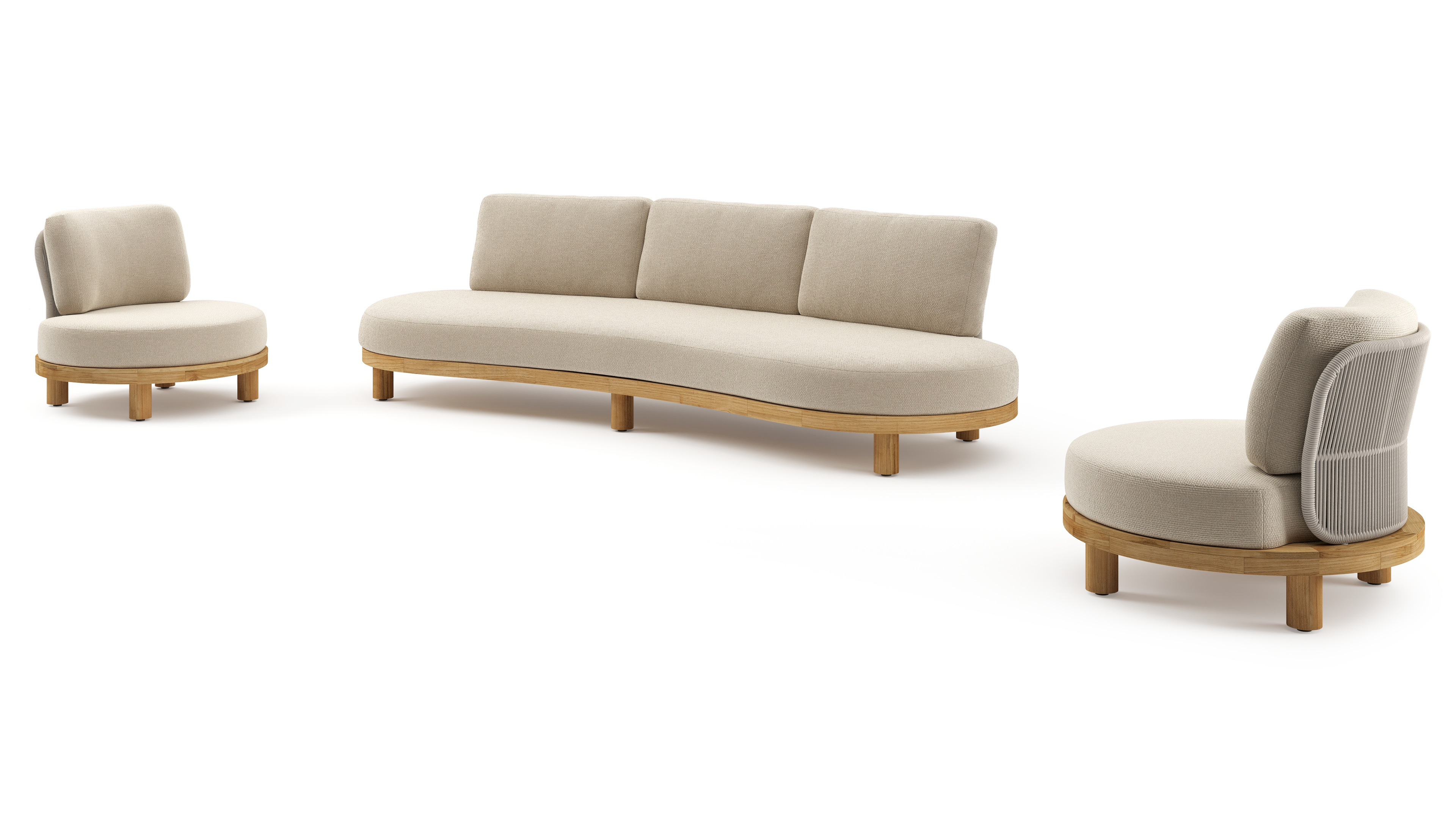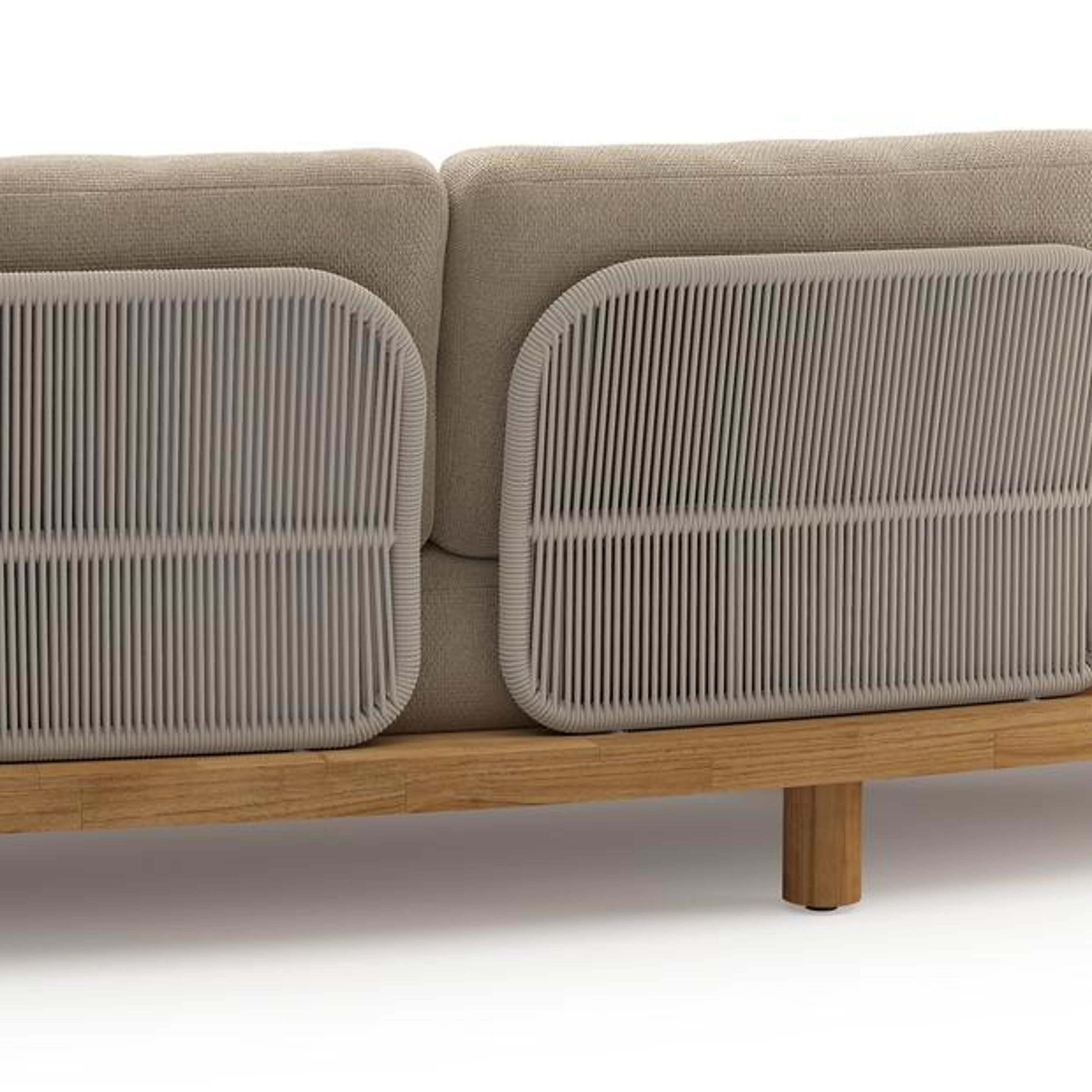 Donato loungeset in teak en beige verticaal geweven ronde rope met all weather cosytica Althea Chalk kussen | Exterioo tuinmeubelen