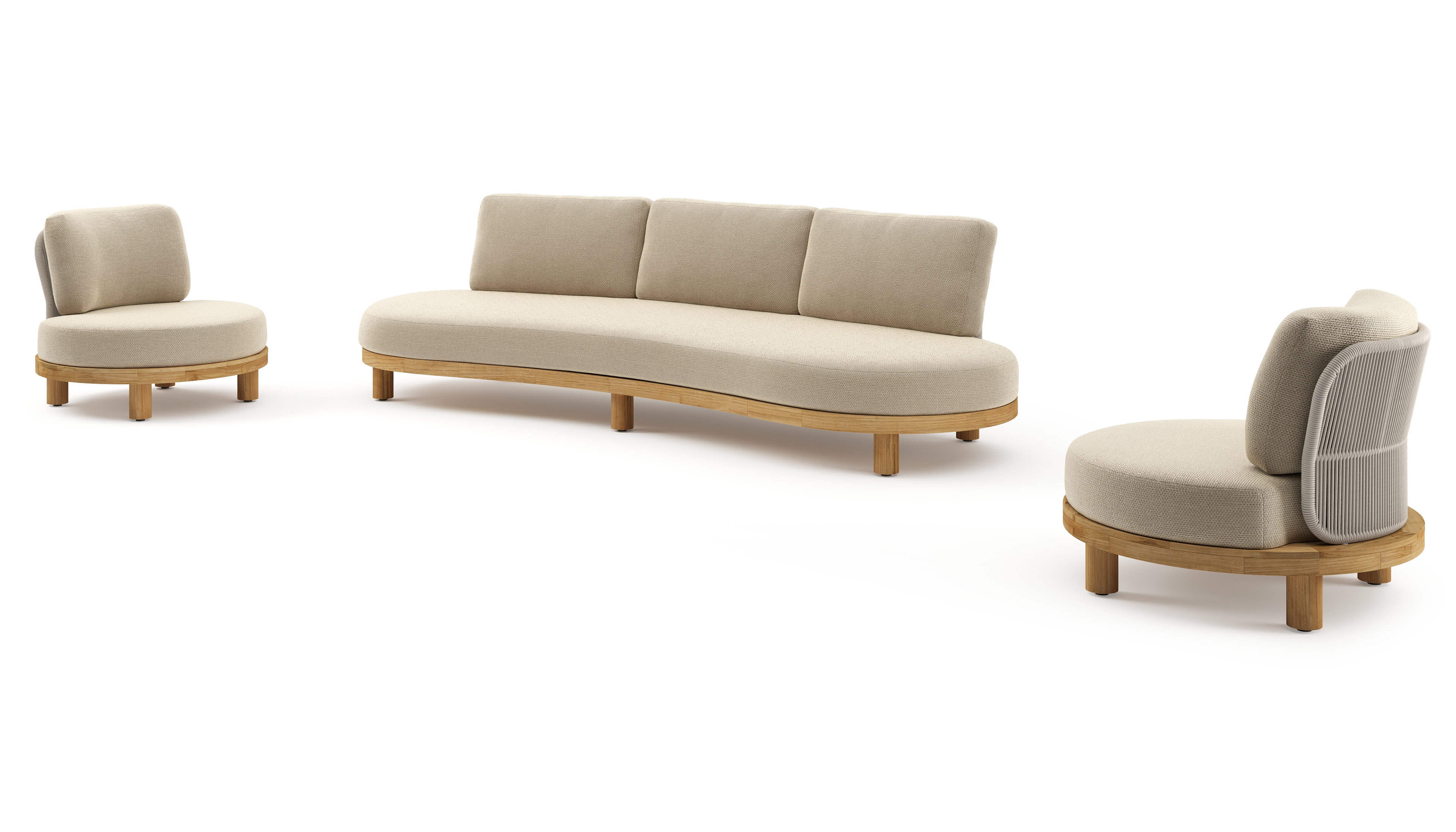 Donato loungeset in teak en beige verticaal geweven ronde rope met all weather cosytica Althea Camel kussen | Exterioo tuinmeubelen