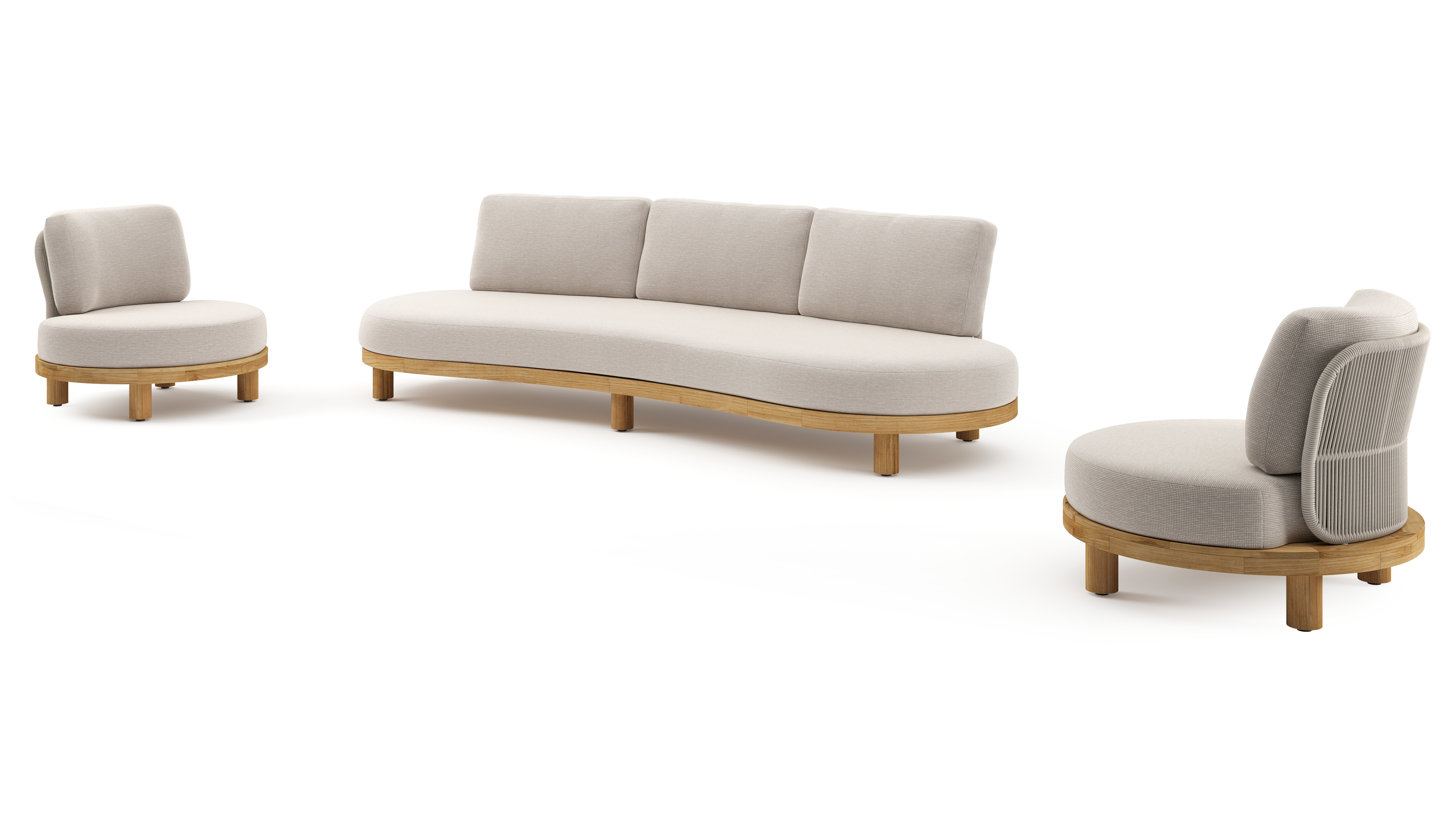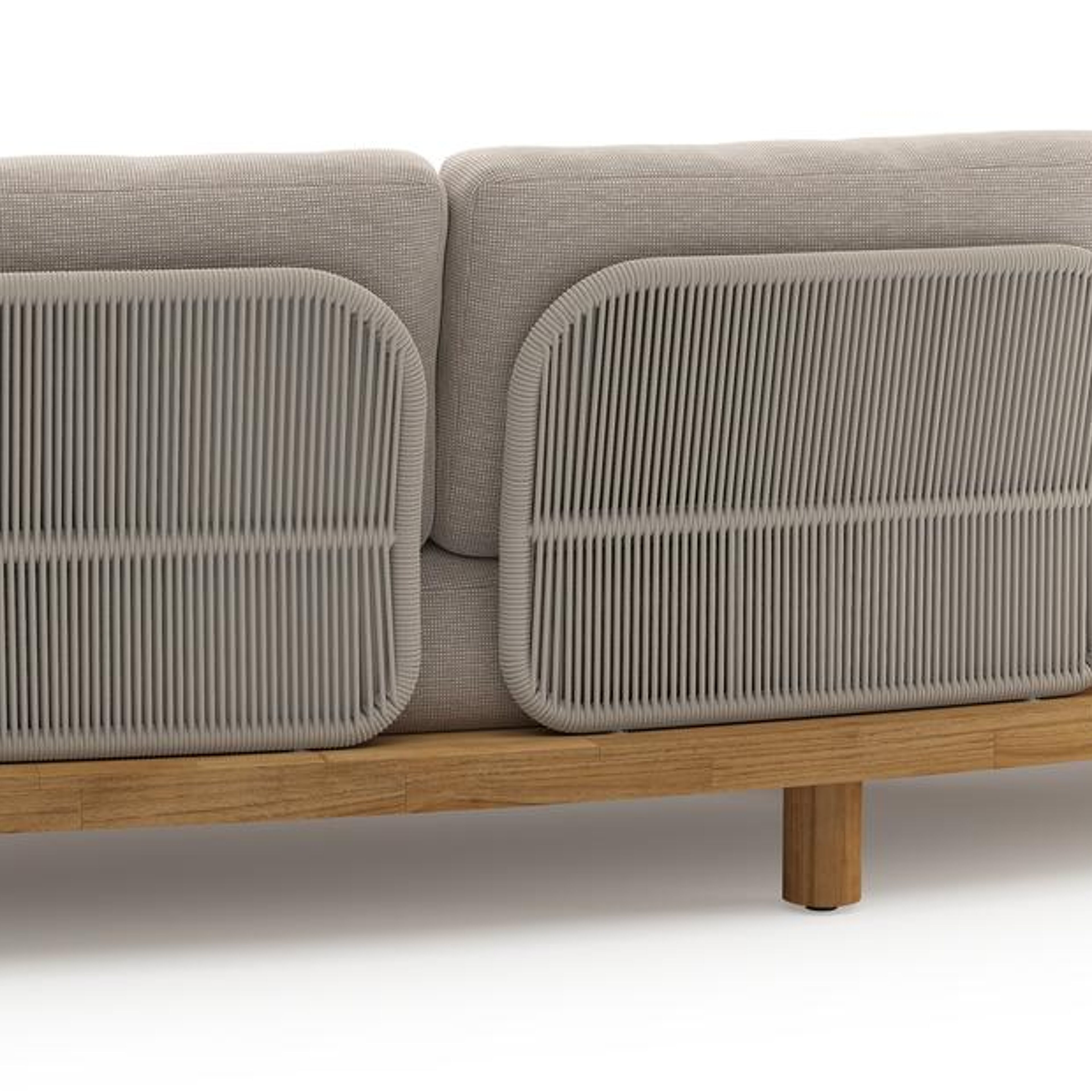 Donato loungeset in teak en beige verticaal geweven ronde rope met all weather sunbrella® luxe Slow Farafra kussen | Exterioo tuinmeubelen