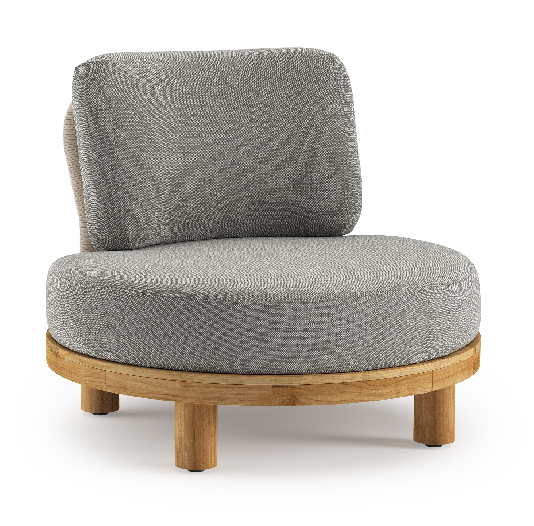 Donato loungestoel in teak en beige verticaal geweven ronde rope met all weather sunbrella® luxe Savane Zinc kussen | Exterioo tuinmeubelen