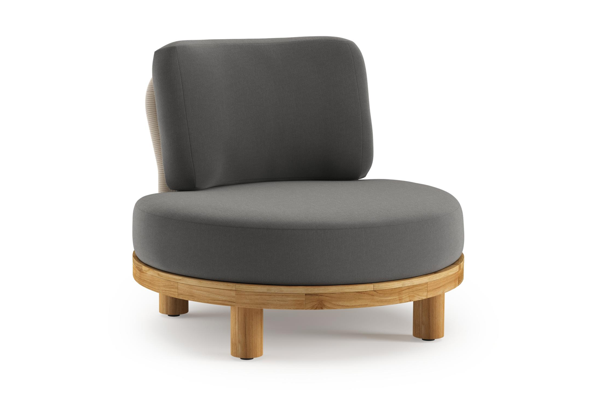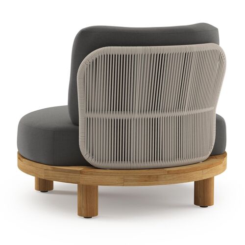 Donato loungestoel in teak en beige verticaal geweven ronde rope met all weather sunbrella® luxe Natte Charcoal Chine kussen | Exterioo