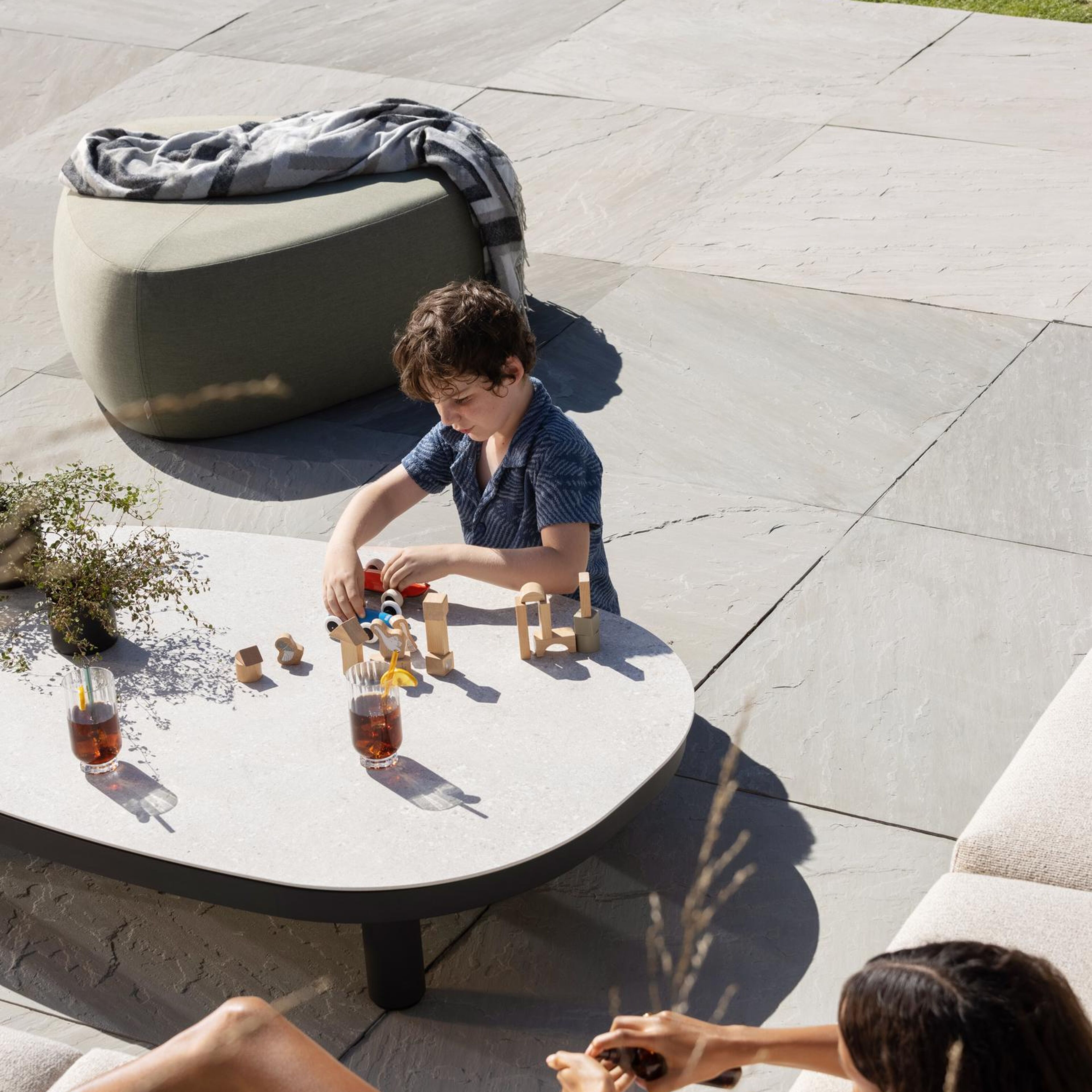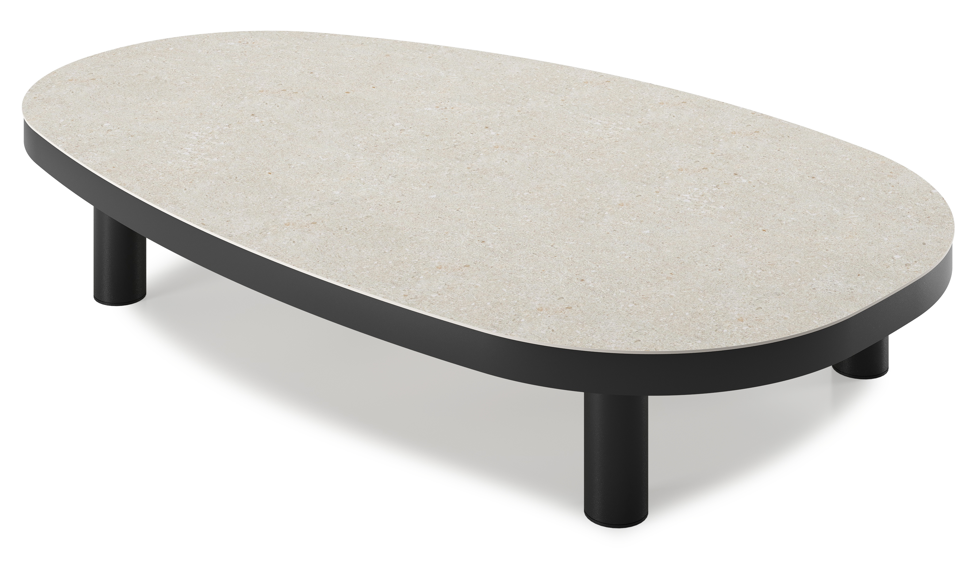 De Donato loungetafel is een trendy exemplaar dankzij zijn organische vorm. Het frame is strak aluminium. De aardse kleurschakeringen van het tafelblad in Shilin passen perfect bij de nieuwste outdoortrends. In het tafelblad is er een licht reliëf en fijne glinster die het Shilin blad de look & feel geven van echte natuursteen.
