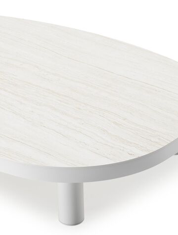 De Donato loungetafel is een trendy exemplaar dankzij zijn organische vorm. Het frame is strak aluminium. Deze loungetafel is afgewerkt met een Calista tafelblad. Het tafelblad Calista doet denken aan het klassiek Serpeggiante-marmer met crèmetinten en rooskleurige aders. Het design vindt zijn oorsprong in Zuid-Italiaanse steengroeves en blinkt uit in eenvoudige schoonheid. Het blad doet een zachte rust neerdwalen in je tuin of op je terras en voegt een natuurlijke charme toe aan je buitenbeleving.