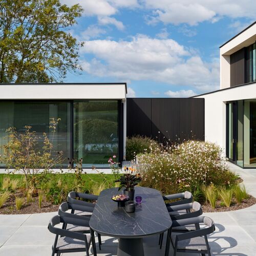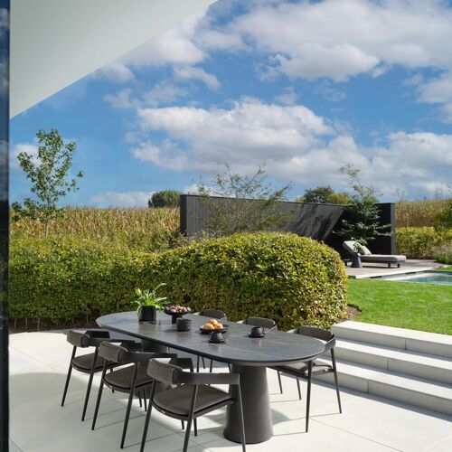 Donato omarmt de natuur met vloeiende vormen, warm teak en stijlvol aluminium in wit, zwart of beige. Een ontwerp dat rust uitstraalt, karakter toevoegt en natuurlijke elegantie naar je tuin brengt.