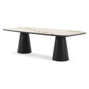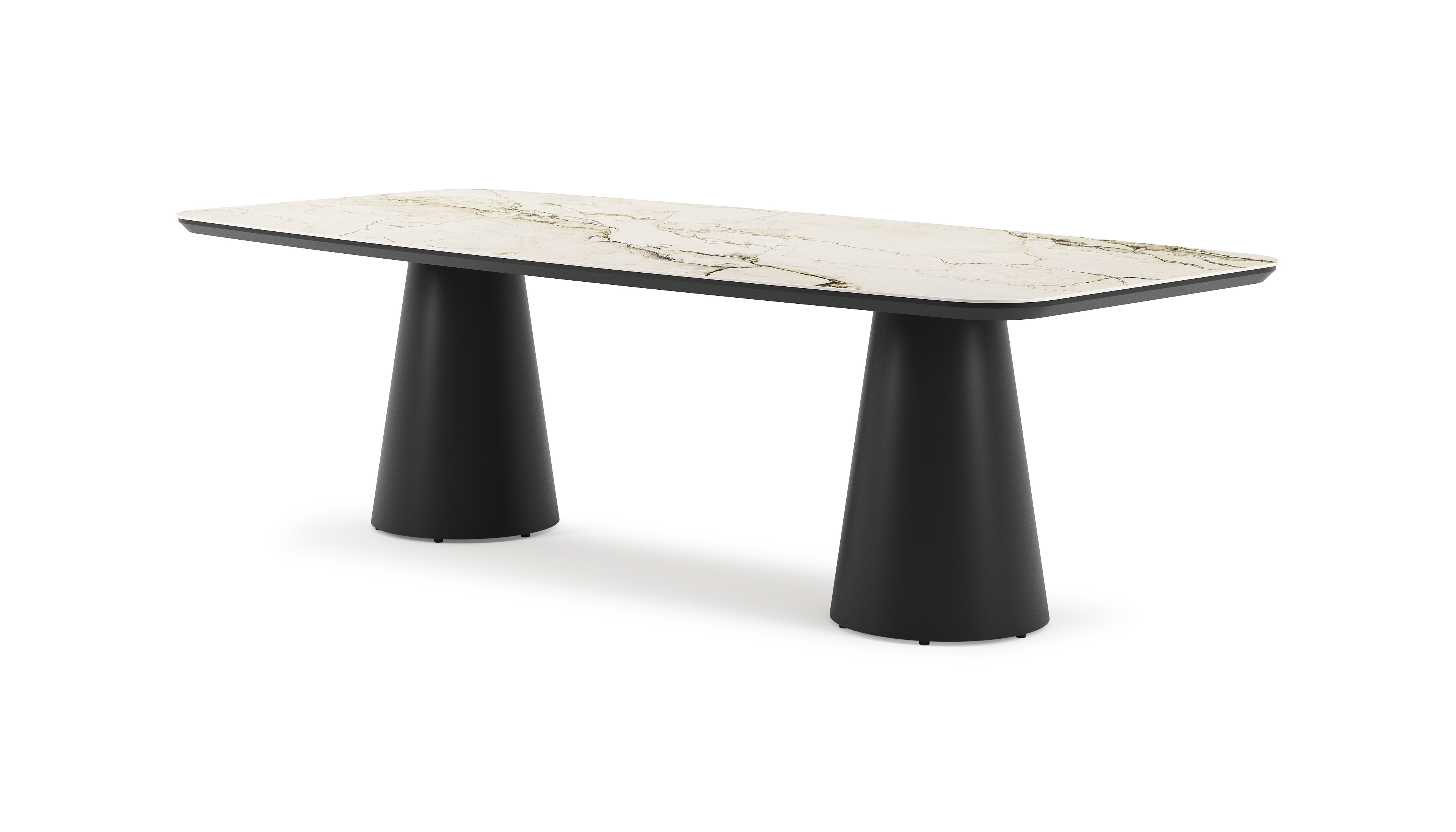 De Donato tuintafel omarmt elegantie in de buitenlucht met robuuste speelse vormen. Met een conische poot volledig gemaakt uit aluminium en een afgerond tafelblad, creëert deze tafel een harmonieuze samensmelting van een hedendaags design en een robuuste look.