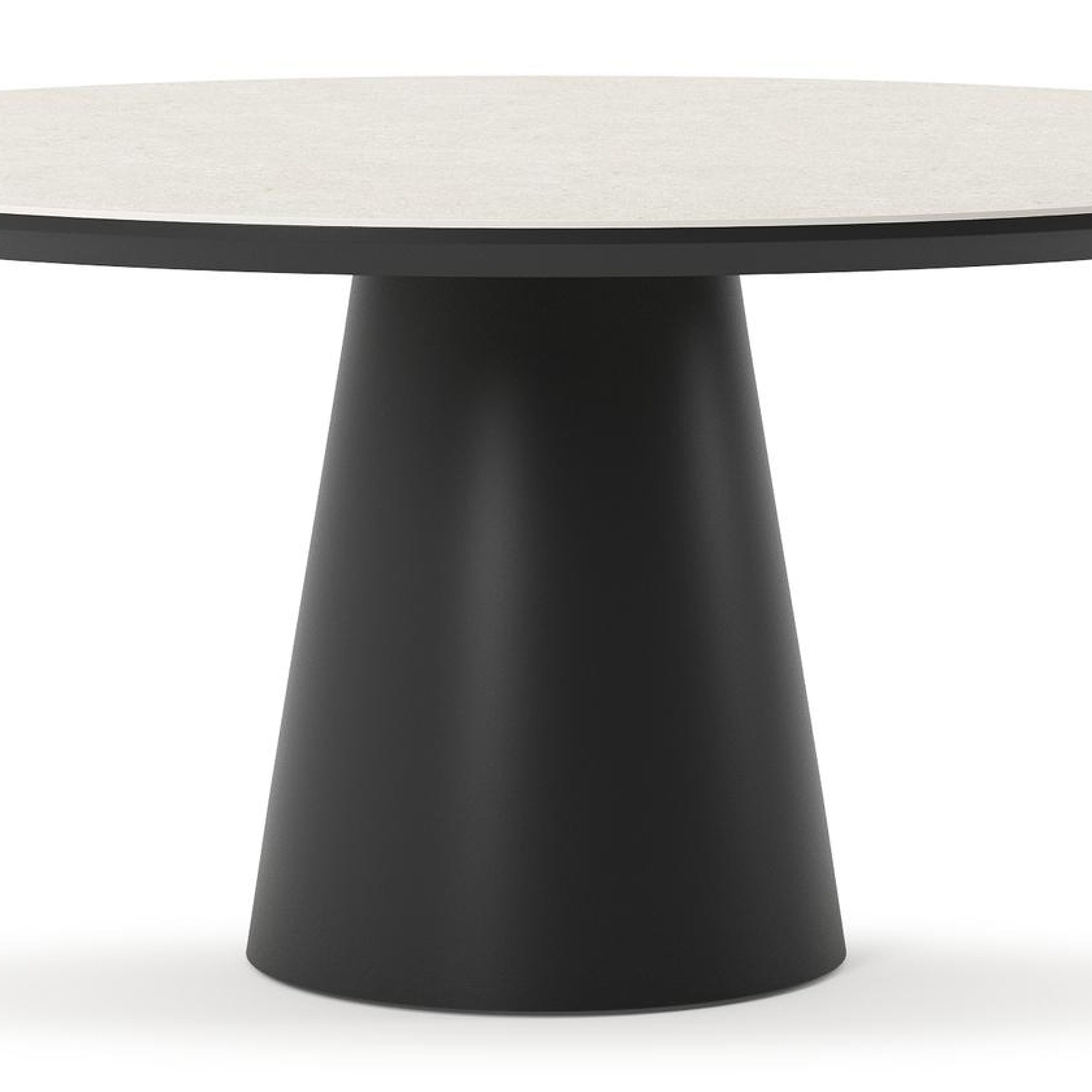 De Donato tuintafel omarmt elegantie in de buitenlucht met robuuste speelse vormen. Met een conische poot volledig gemaakt uit aluminium en een afgerond tafelblad, creëert deze tafel een harmonieuze samensmelting van een hedendaags design en een robuuste look.