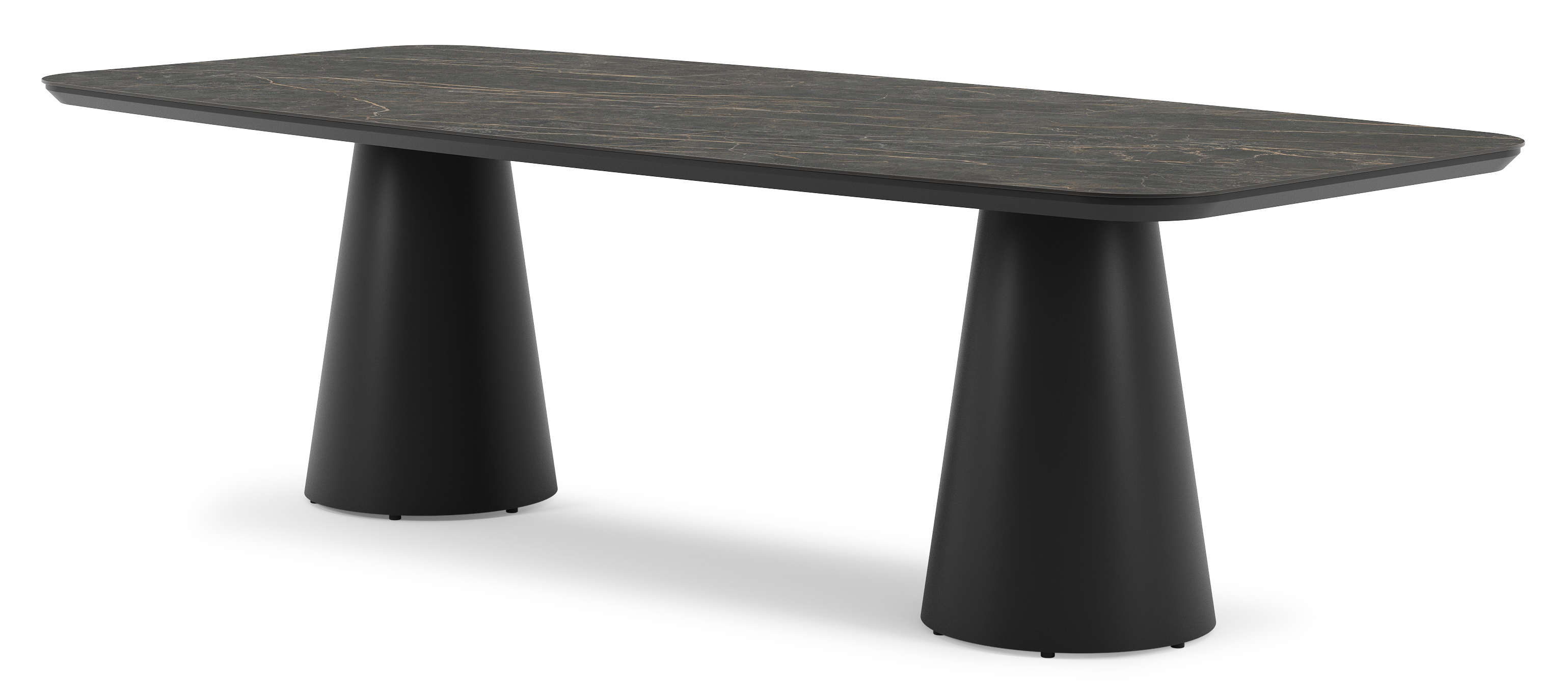 De Donato tuintafel omarmt elegantie in de buitenlucht met robuuste speelse vormen. Met een conische poot volledig gemaakt uit aluminium en een afgerond tafelblad, creëert deze tafel een harmonieuze samensmelting van een hedendaags design en een robuuste look.