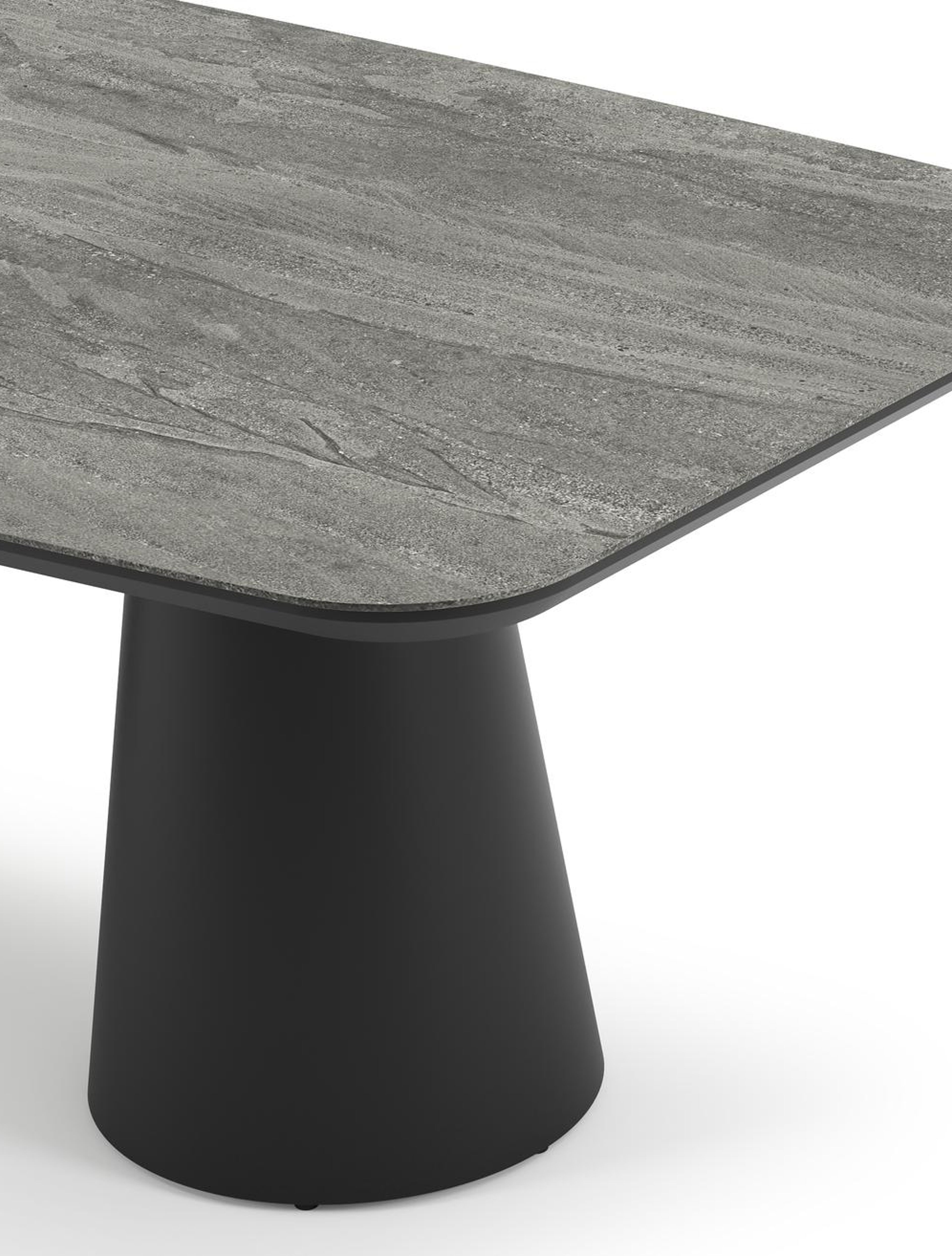 De Donato tuintafel omarmt elegantie in de buitenlucht met robuuste speelse vormen. Met een conische poot volledig gemaakt uit aluminium en een afgerond tafelblad, creëert deze tafel een harmonieuze samensmelting van een hedendaags design en een robuuste look.
